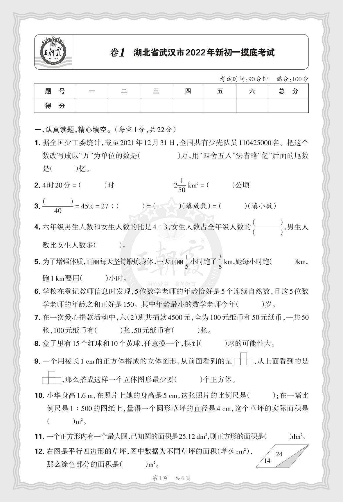 小升初数学·湖北省武汉市2022年新初一摸底考试【1】