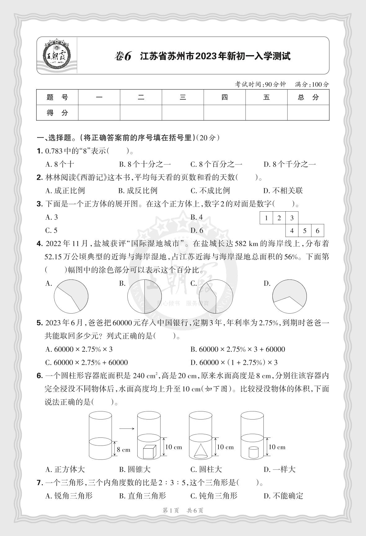 小升初数学·江苏省苏州市2023年新初一入学测试【6】
