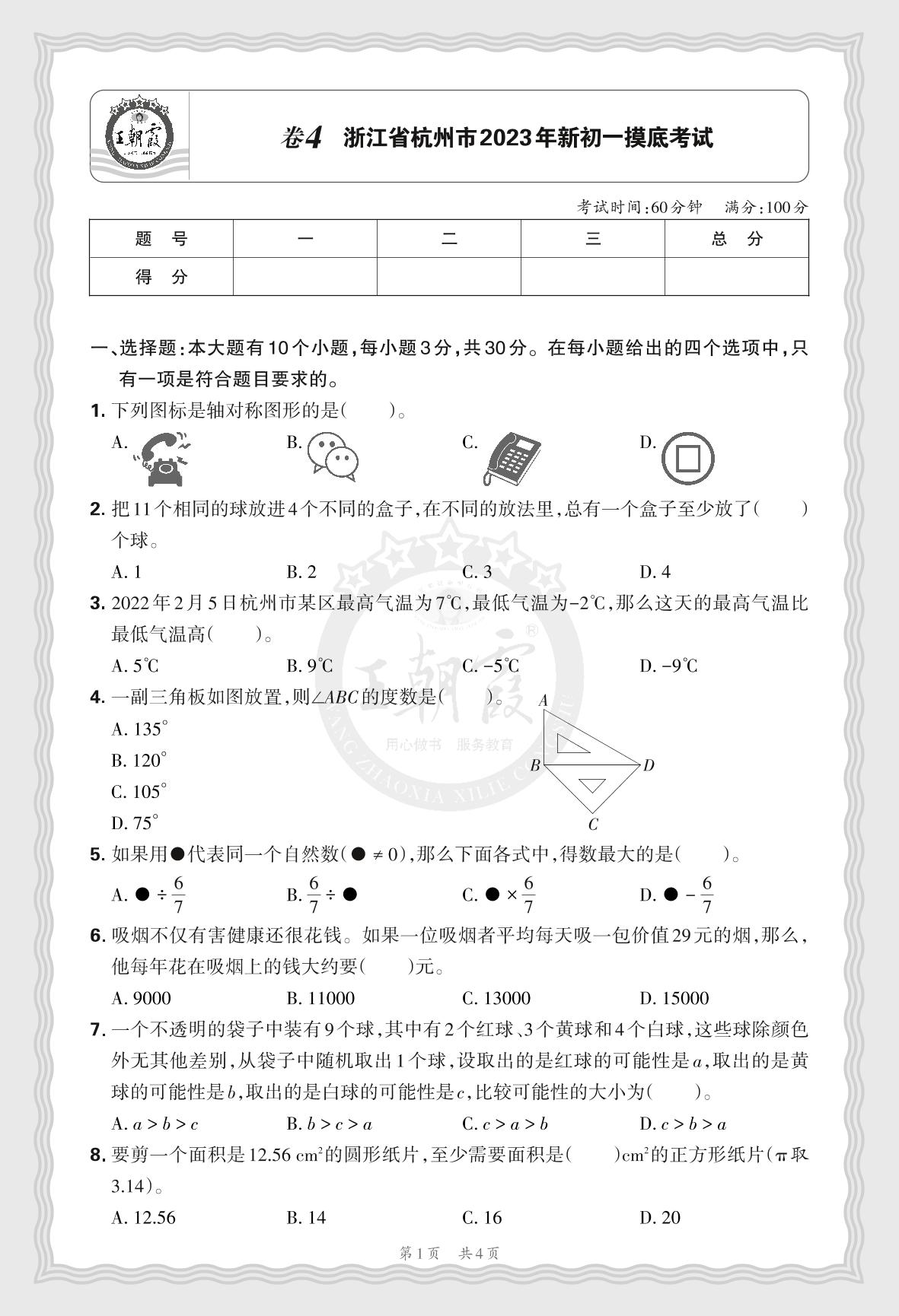 小升初数学·浙江省杭州市2023年新初一摸底考试【4】