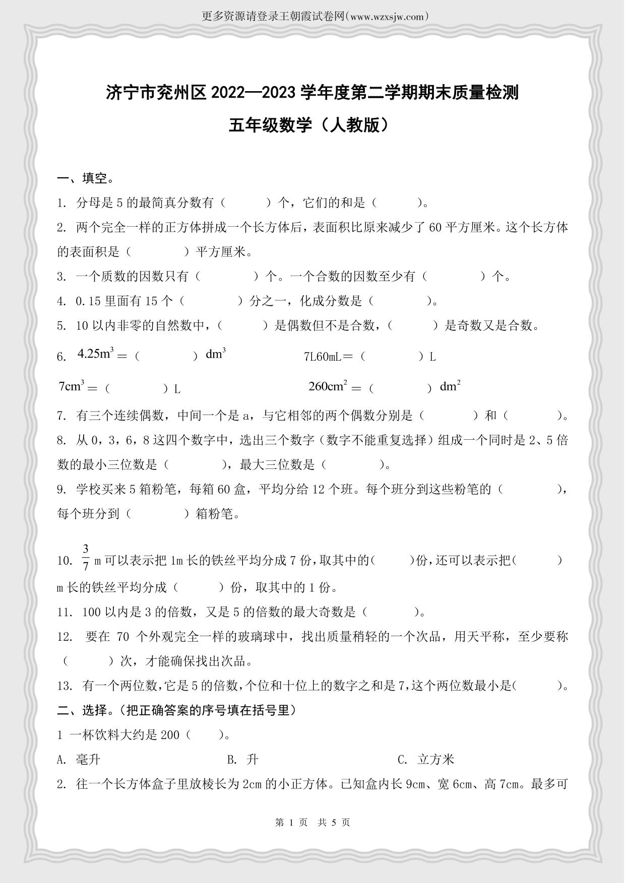山东省济宁市兖州区2022-2023学年度第二学期期末质量检测五年级数学(人教版)