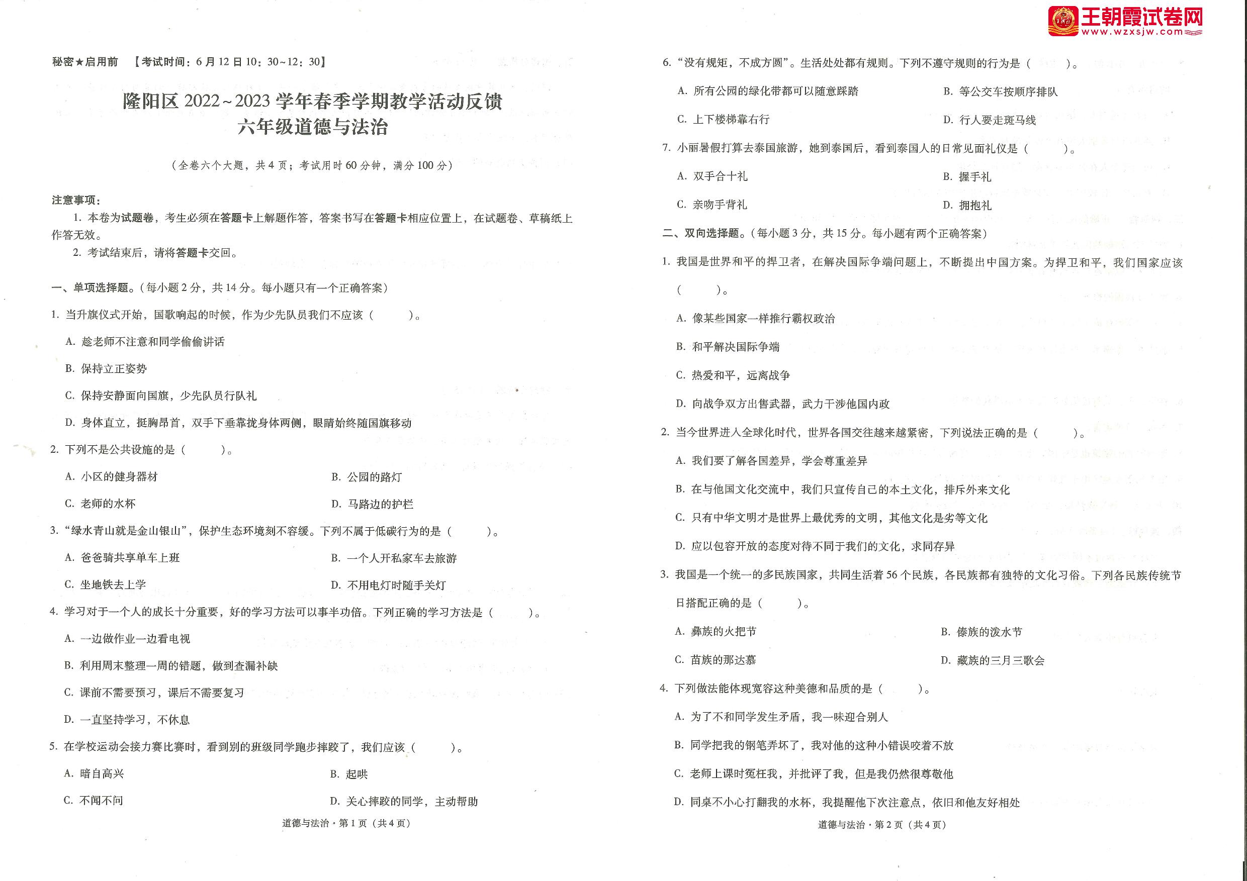 云南省保山市隆阳区2022-2023学年第二学期期末教学活动反馈六年级道德与法治(人教版)