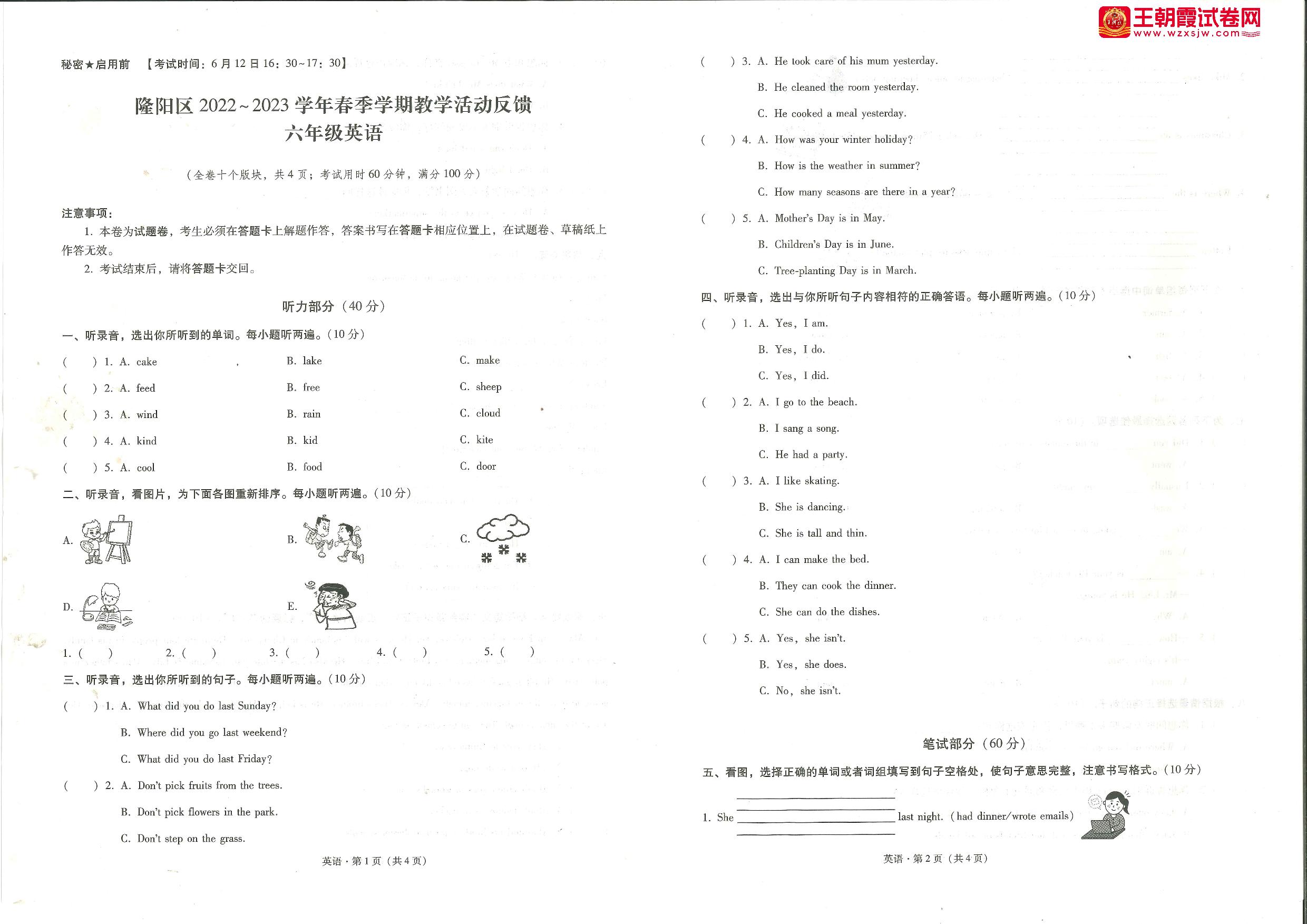 六年级英语人教PEP版(三起始)下册期末卷