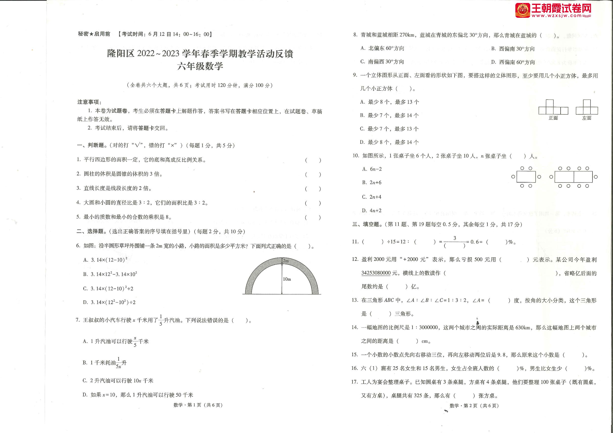 云南省保山市隆阳区2022-2023学年第二学期期末教学活动反馈六年级数学(人教版)