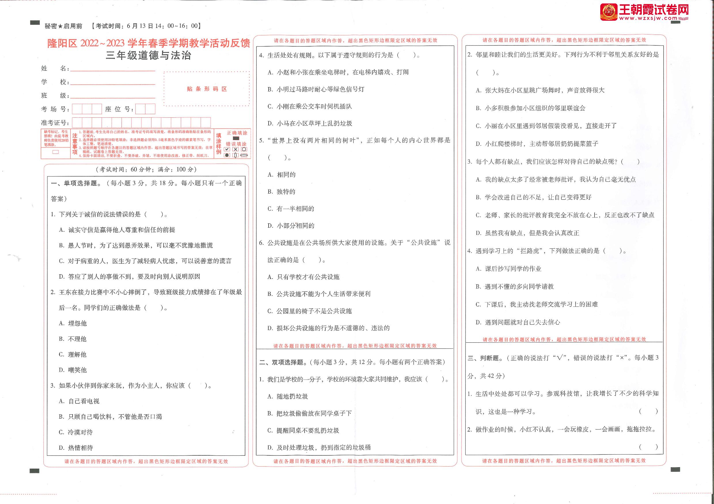 三年级道德与法治人教版下册期末卷