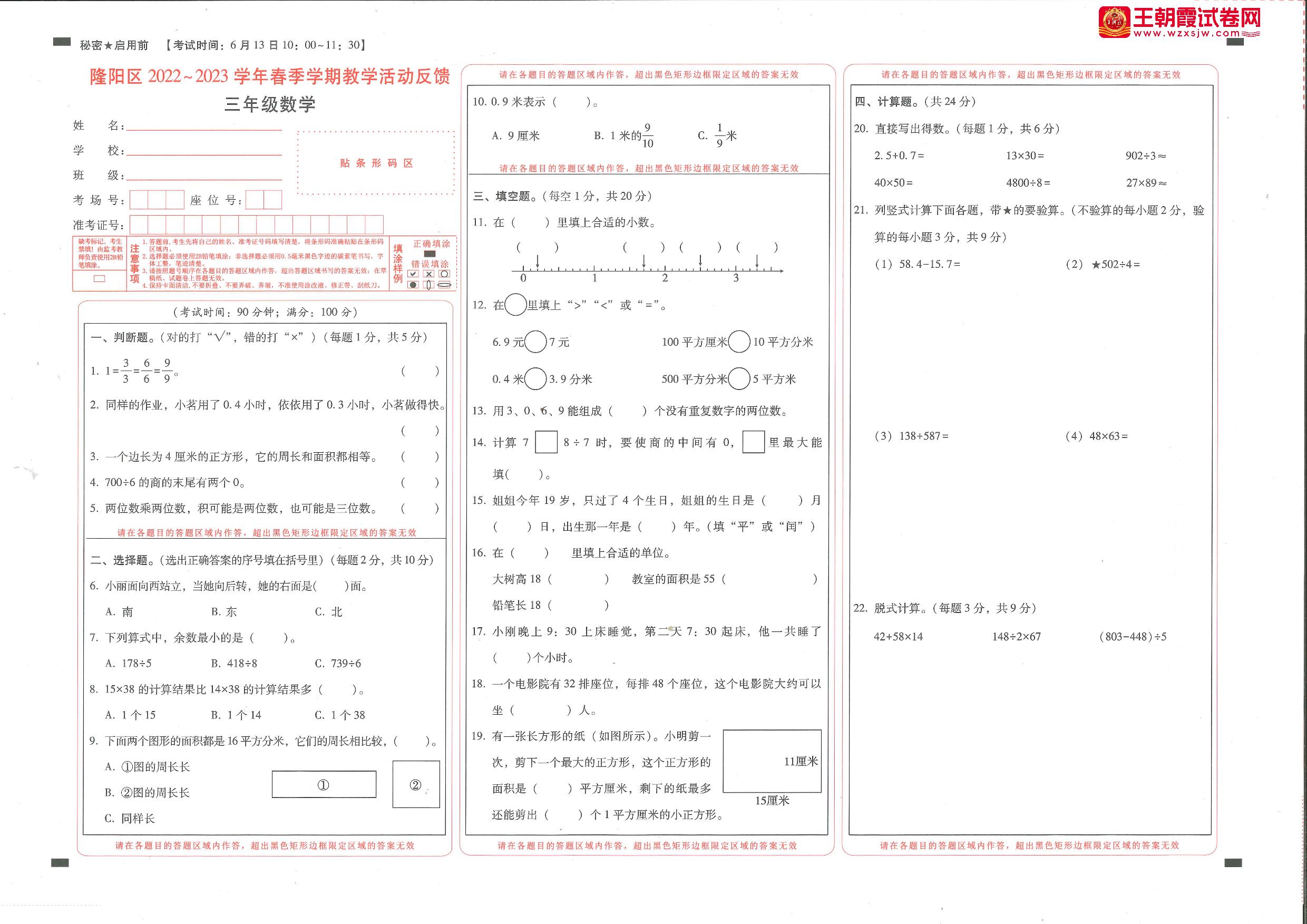 云南省保山市隆阳区2022-2023学年第二学期期末教学活动反馈三年级数学(人教版)