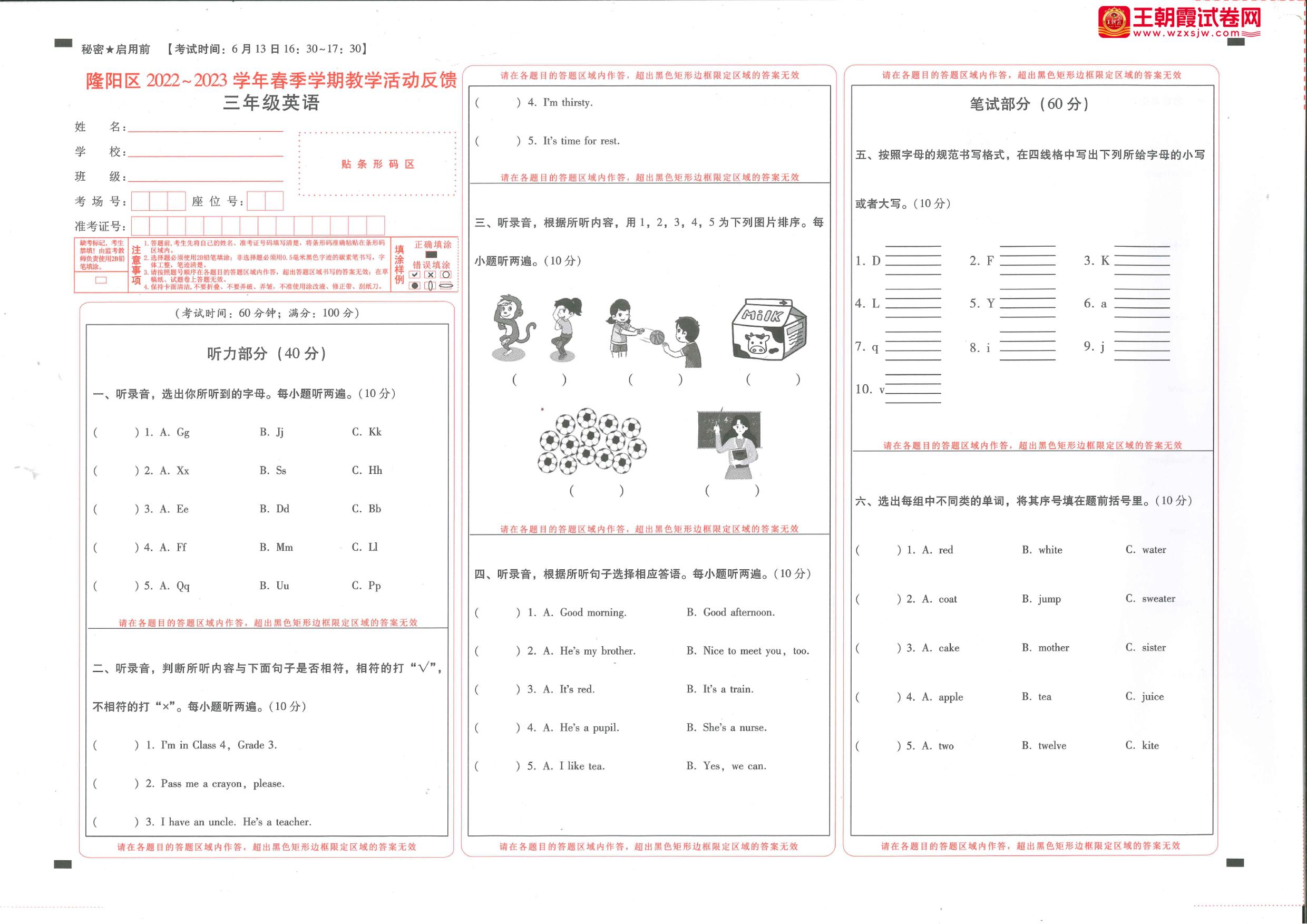 云南省保山市隆阳区2022-2023学年第二学期期末教学活动反馈三年级英语(人教PEP版)