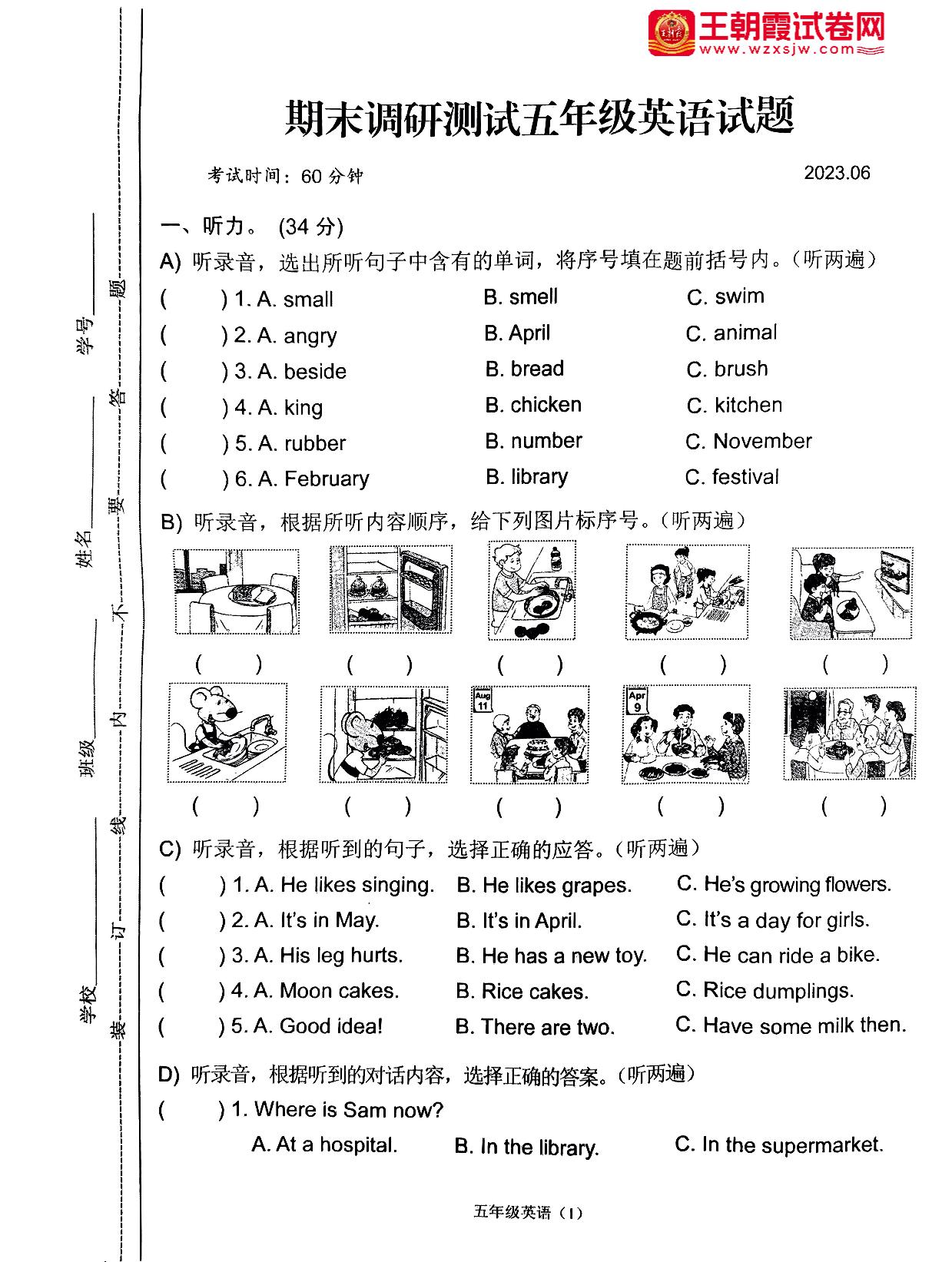 五年级英语译林版(三起始)下册期末卷