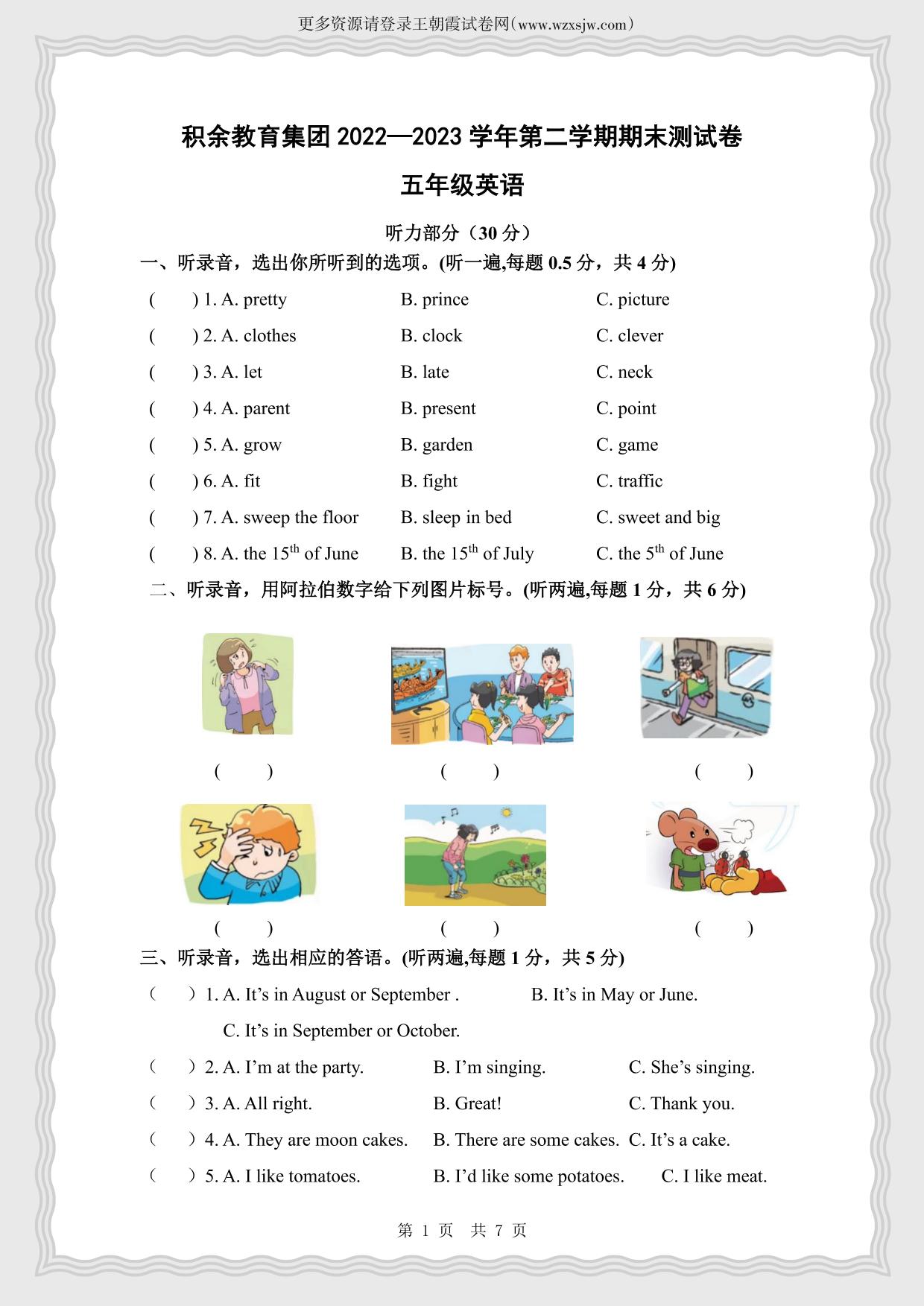 江苏省无锡市积余教育集团2022-2023学年第二学期期末试卷五年级英语(译林版)
