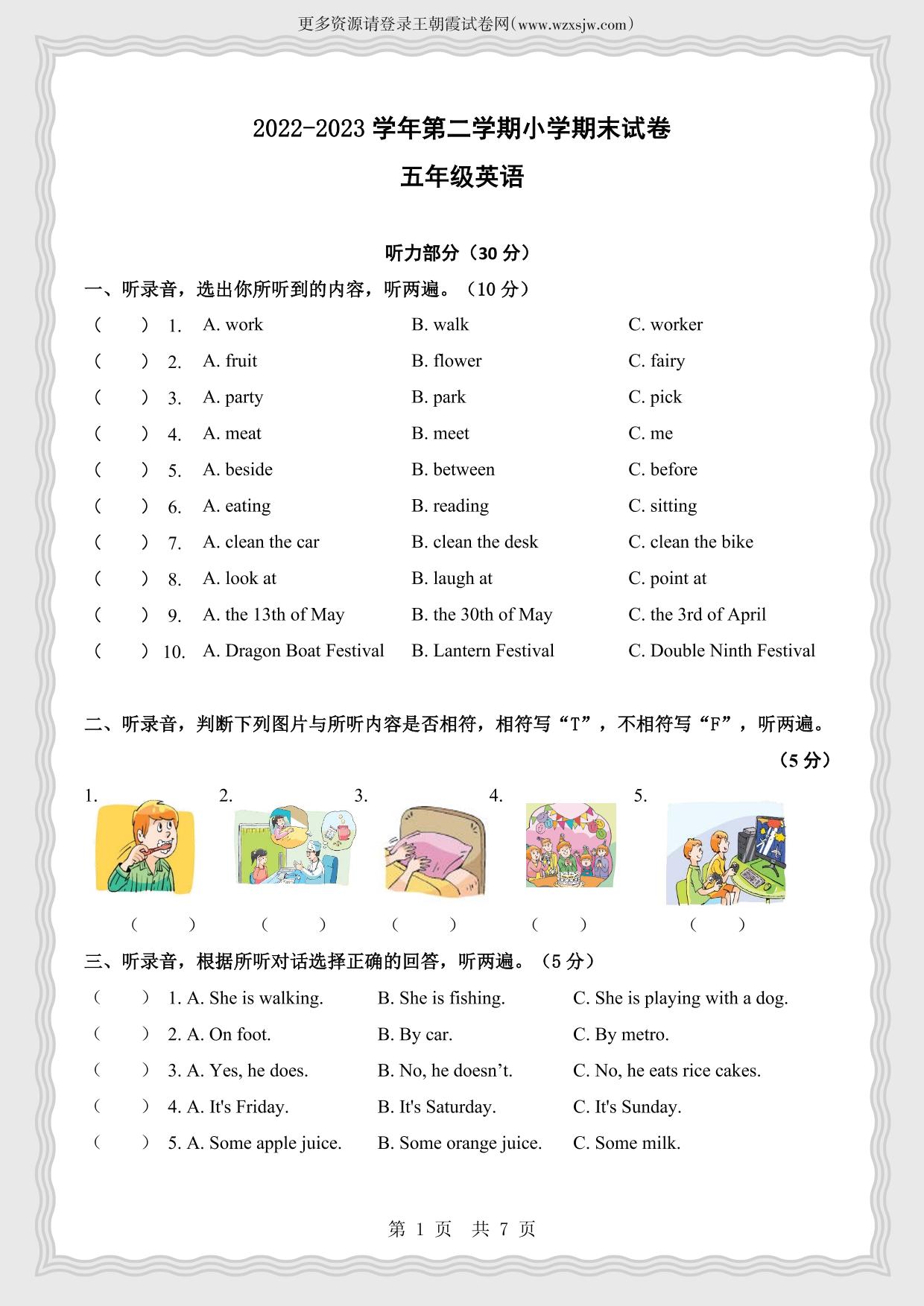 五年级英语译林版(三起始)下册期末卷