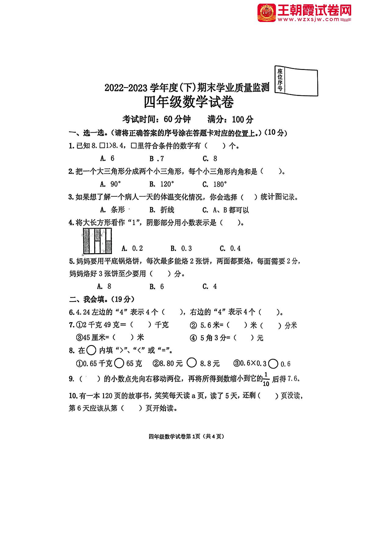 四年级数学人教版下册期末卷