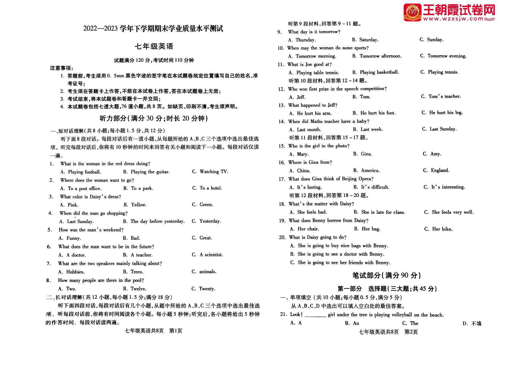 辽宁省沈阳市浑南区2022-2023学年下学期期末学业质量水平测试七年级英语(人教版)【无听力音频】
