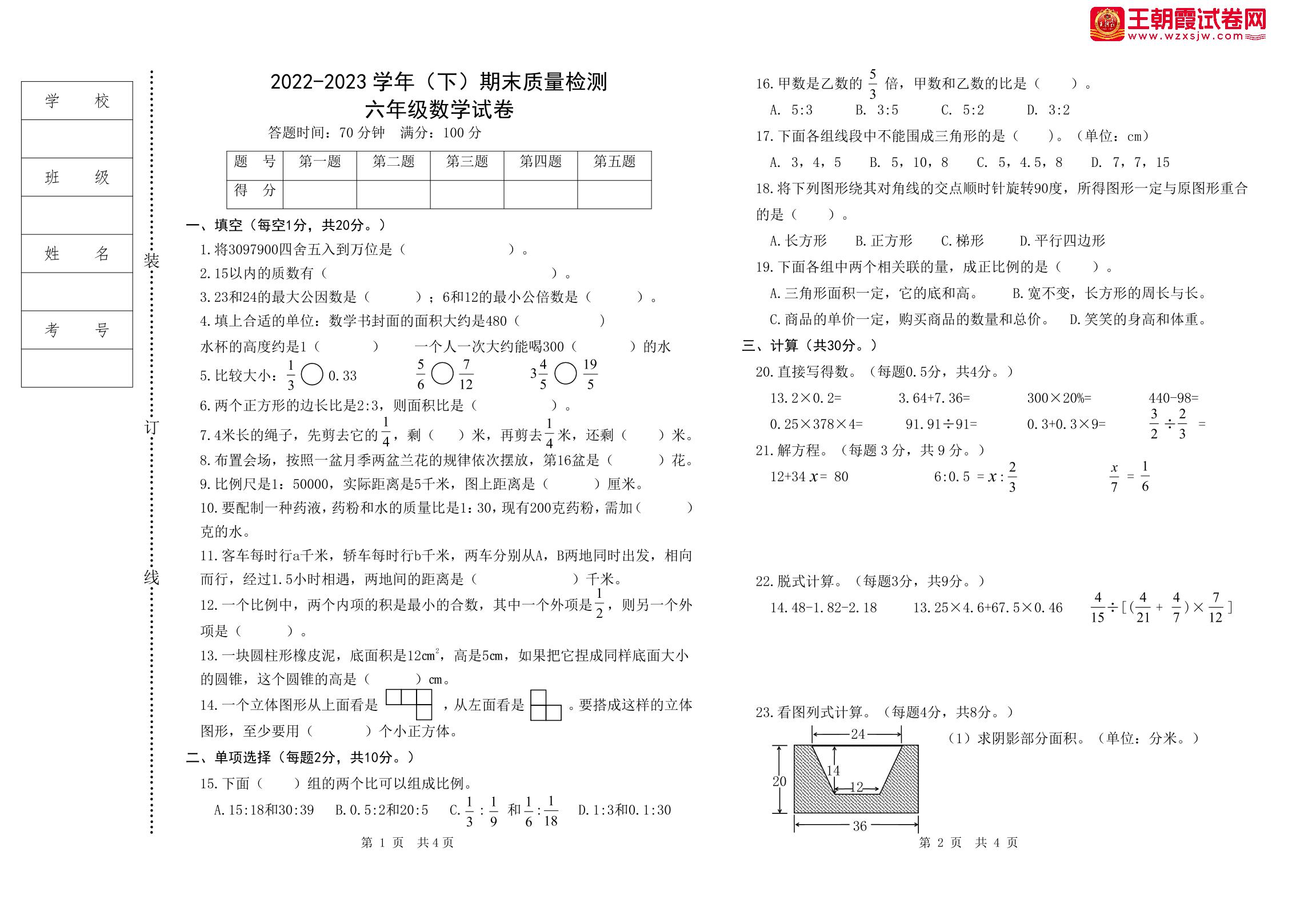 辽宁省本溪市本溪县2022-2023学年下学期期末质量检测六年级数学(北师版)