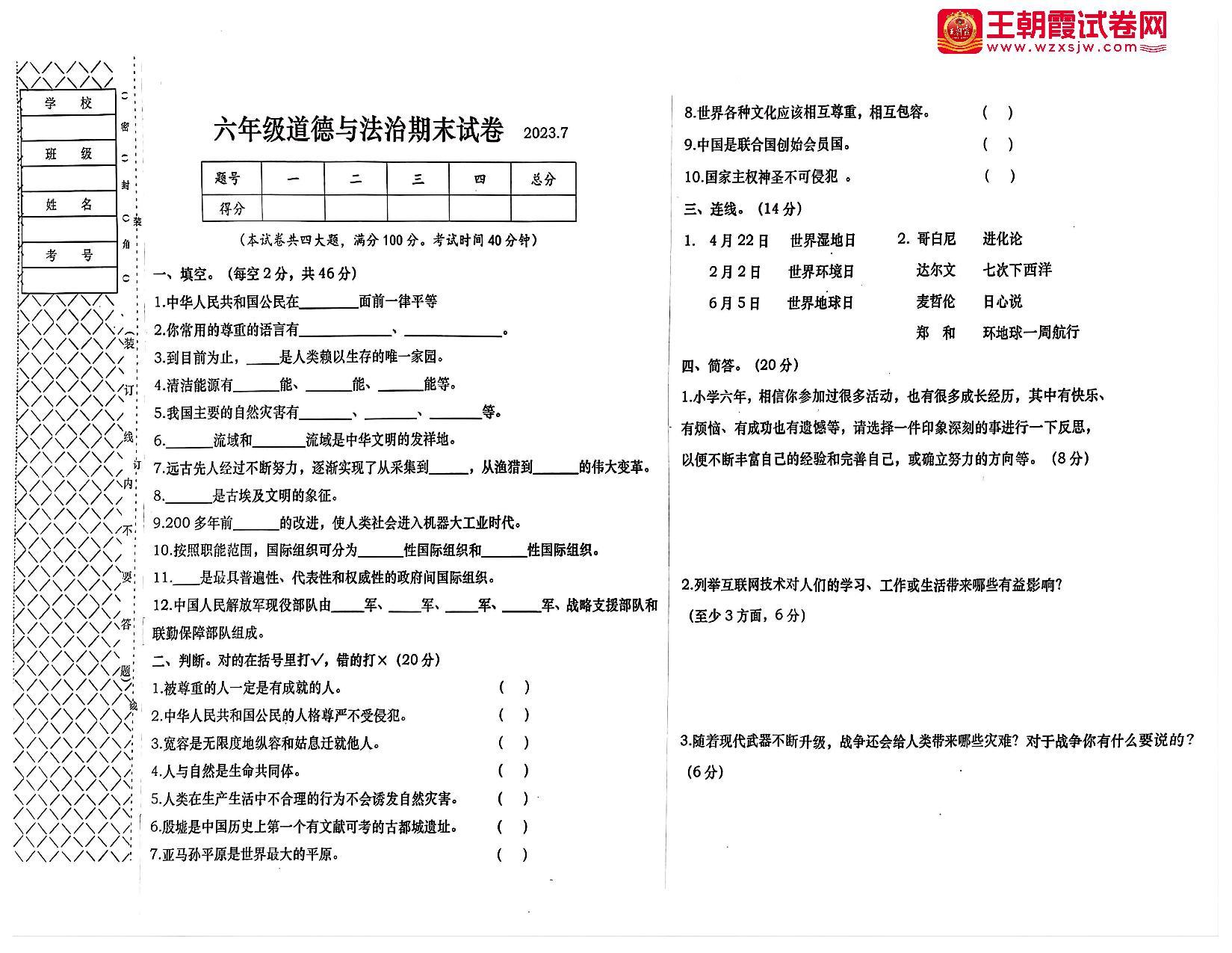 六年级道德与法治人教版下册期末卷
