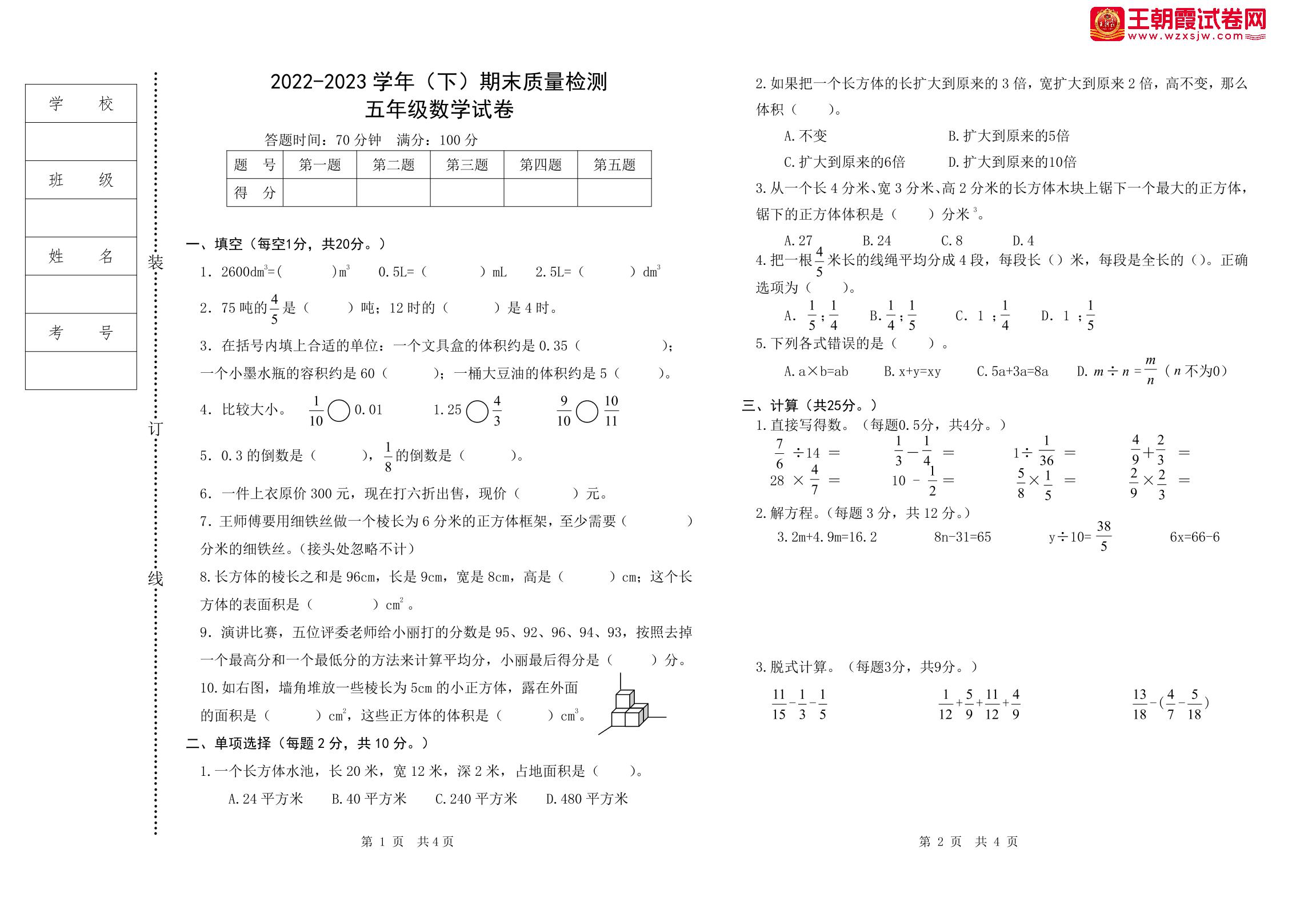 辽宁省本溪市本溪县2022-2023学年下学期期末质量检测五年级数学(北师版)