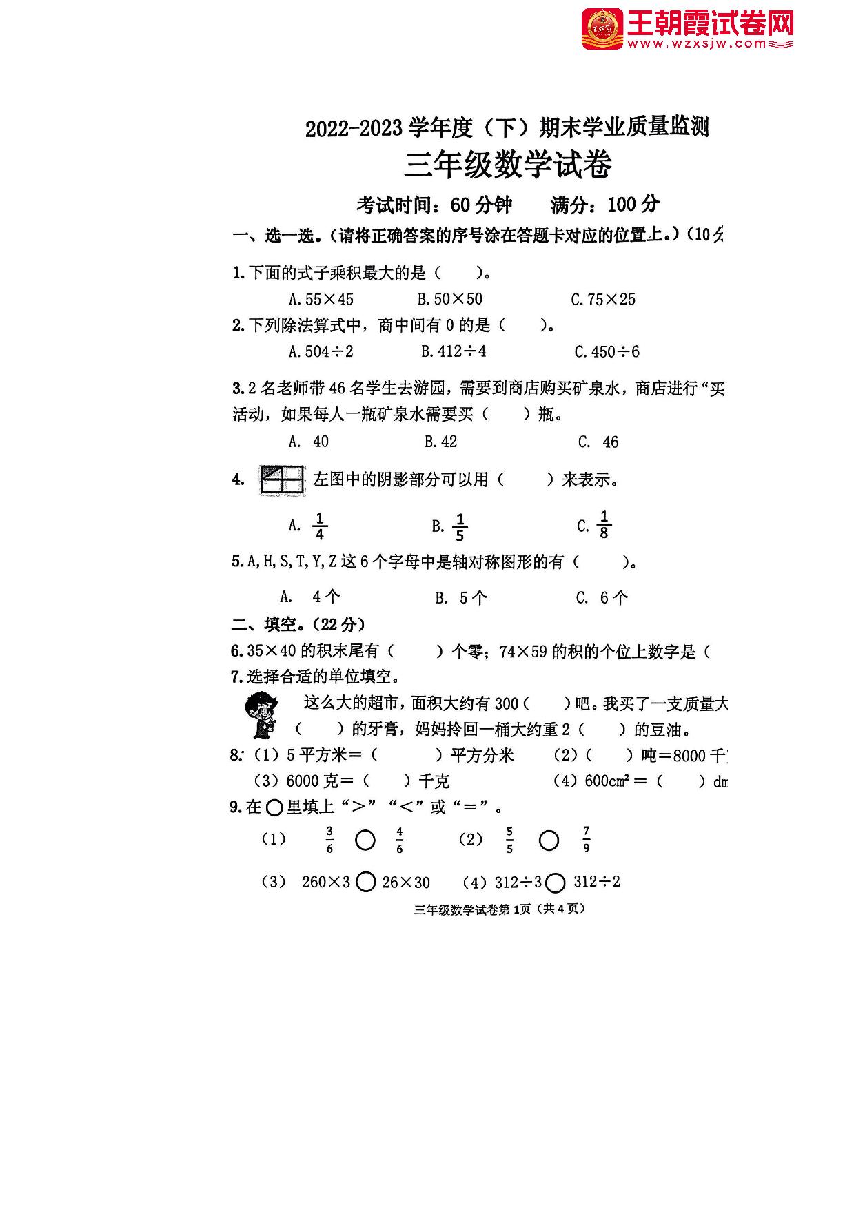 辽宁省丹东市东港市2022-2023学年下学期期末学业质量监测三年级数学(北师版)