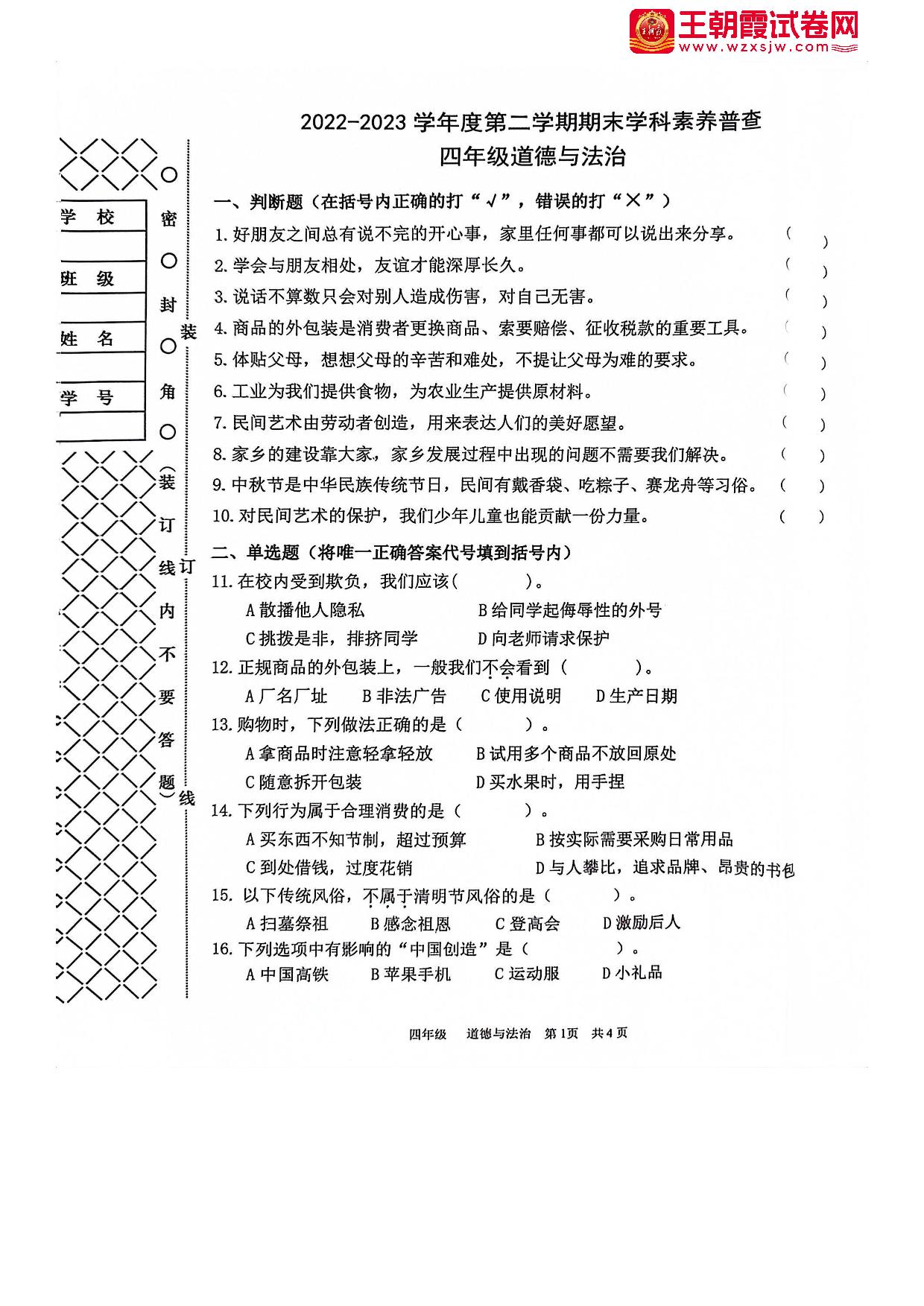辽宁省大连市甘井子区2022-2023学年度第二学期期末学科素养普查四年级道德与法治(人教版)