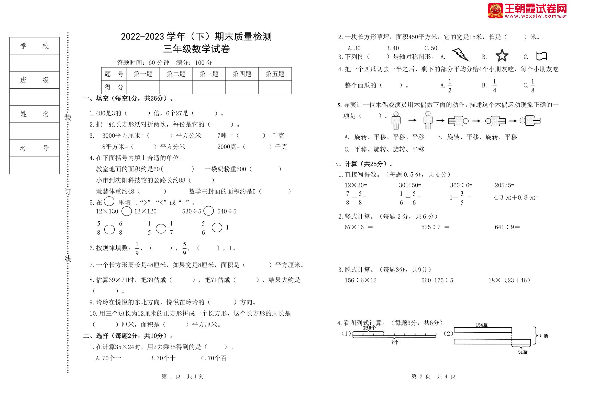 辽宁省本溪市本溪县2022-2023学年下学期期末质量检测三年级数学(北师版)