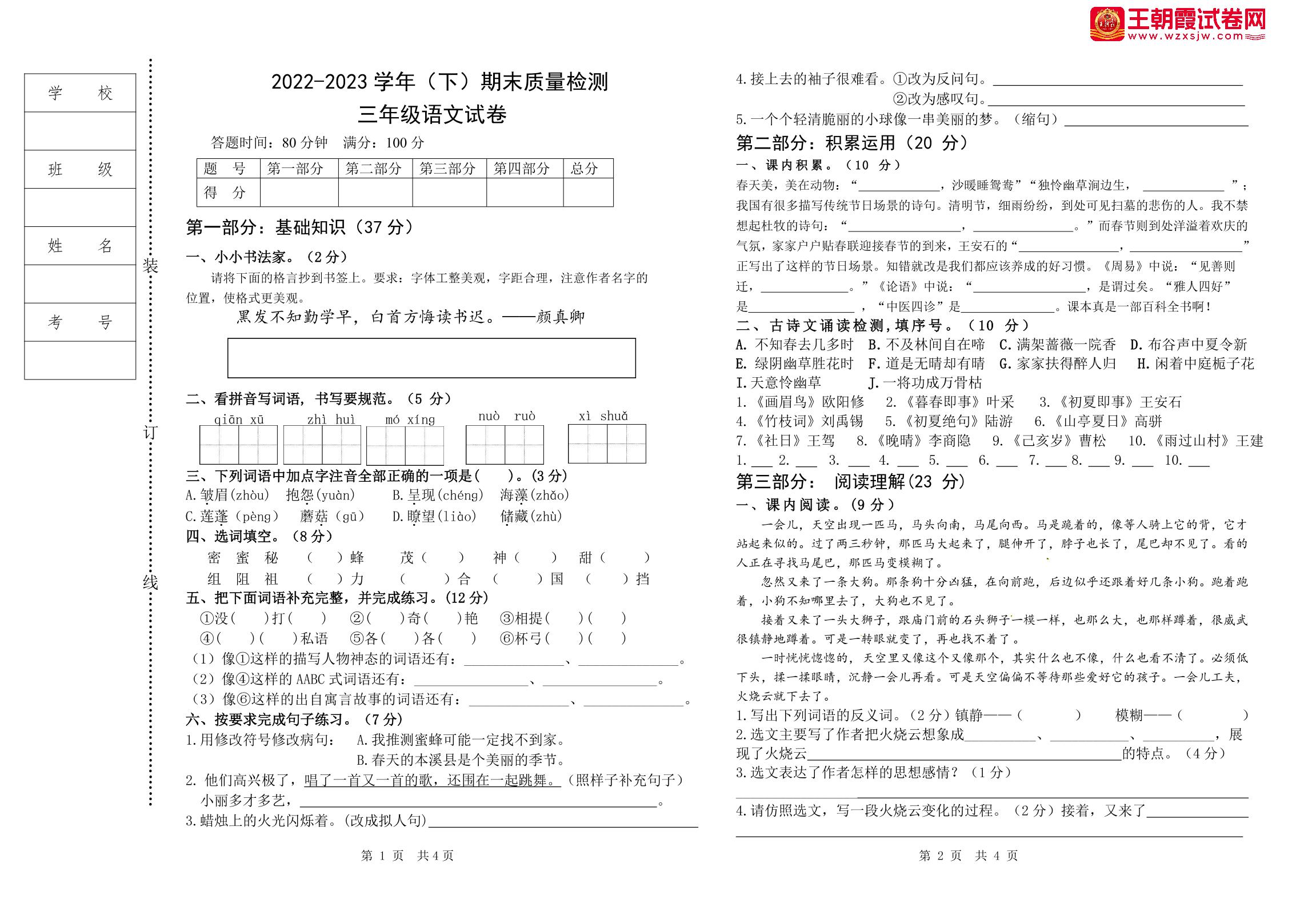 辽宁省本溪市本溪县2022-2023学年下学期期末质量检测三年级语文(人教版)