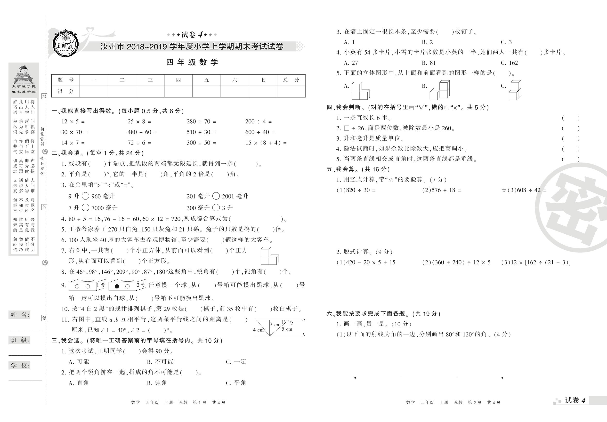 2018-2019学年第一学期汝州市四年级数学试卷(苏教版)【4】