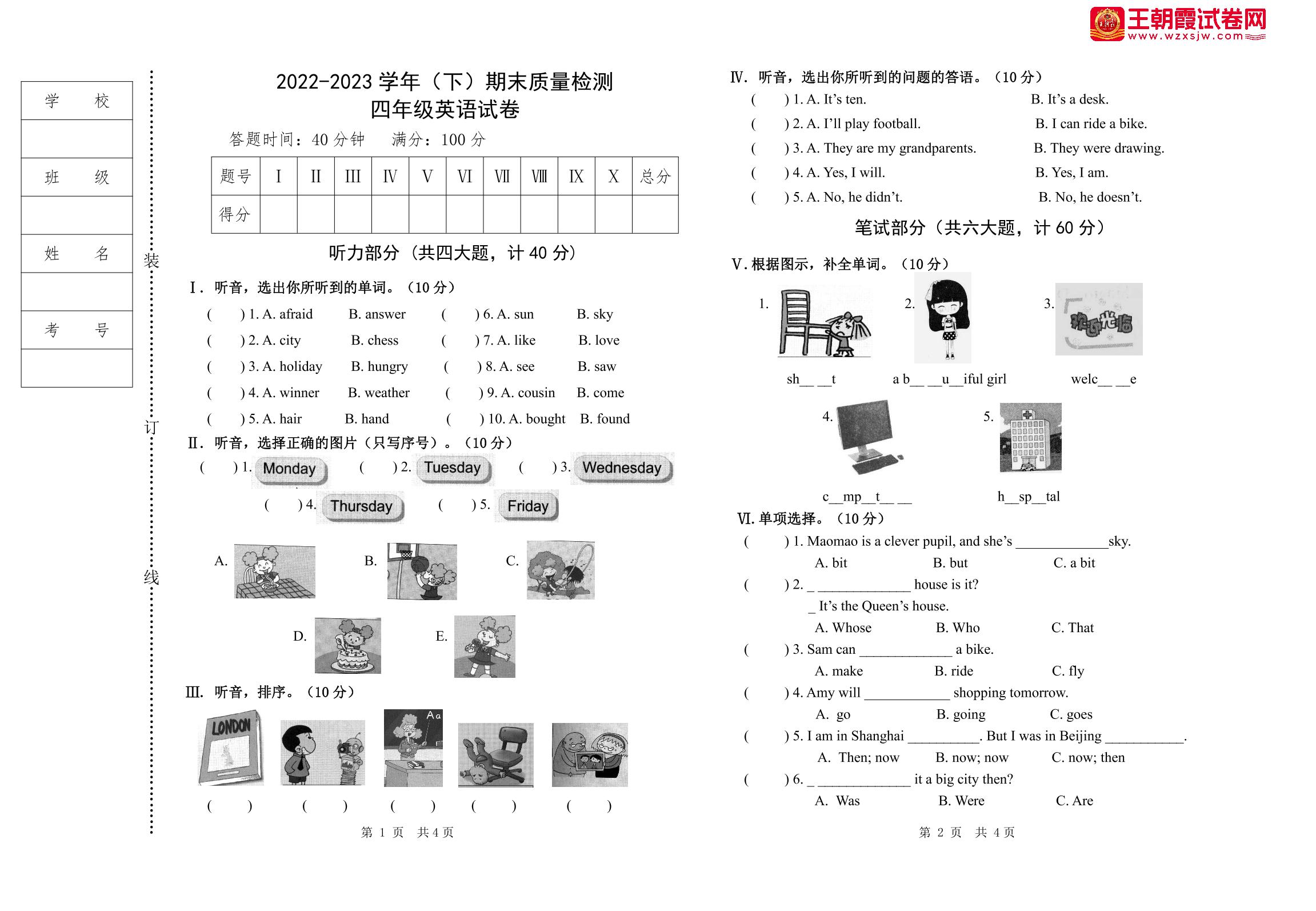 辽宁省本溪市本溪县2022-2023学年下学期期末质量检测四年级英语(外研版)