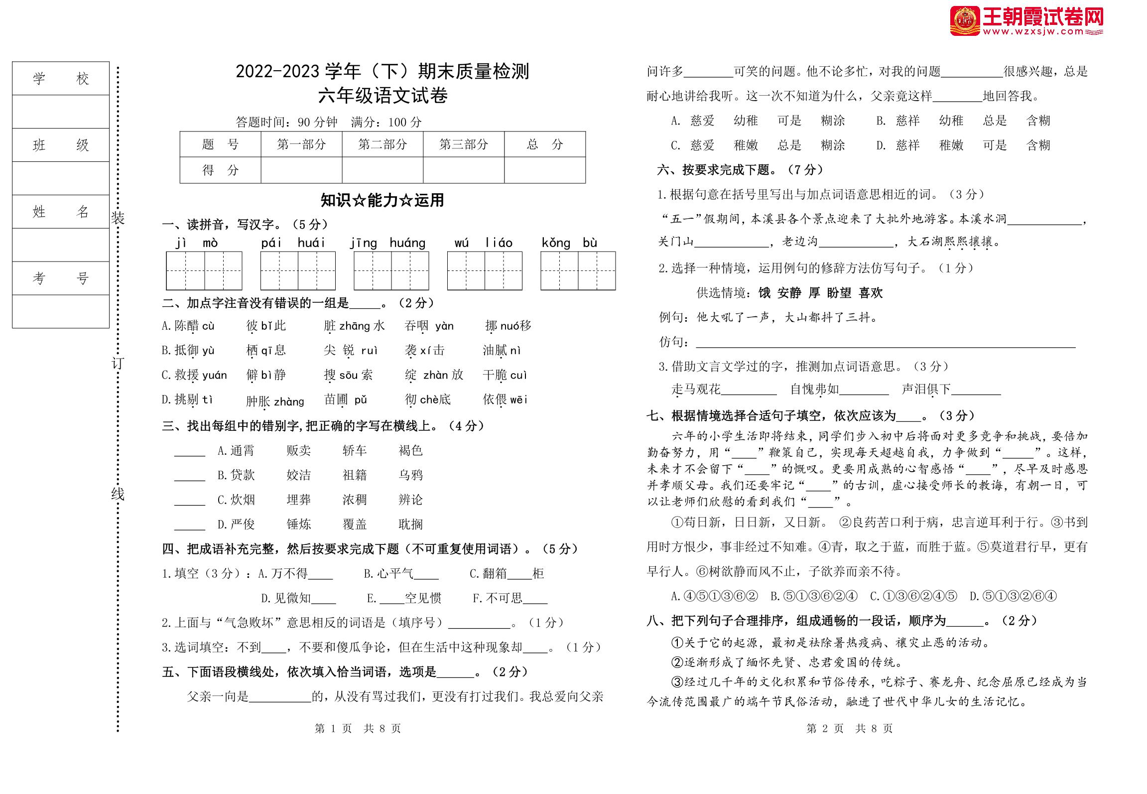 辽宁省本溪市本溪县2022-2023学年下学期期末质量检测六年级语文(人教版)