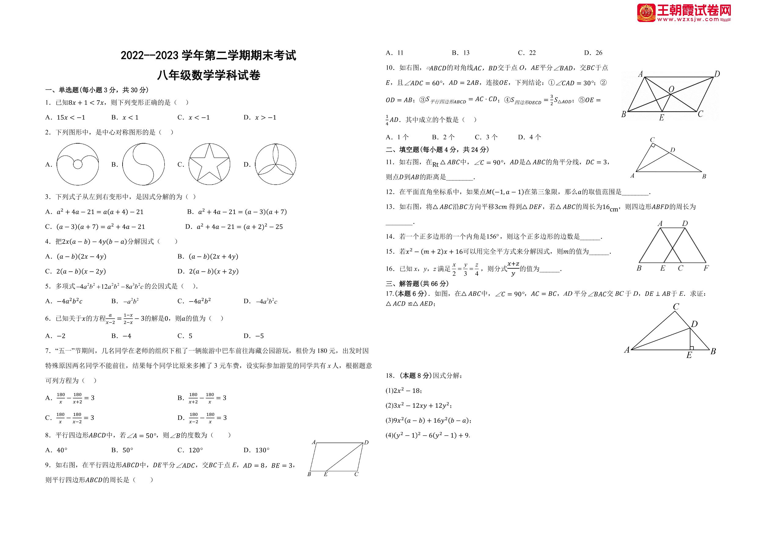 甘肃省兰州市教育局第四片区2022-2023学年第二学期期末考试八年级数学(人教版)