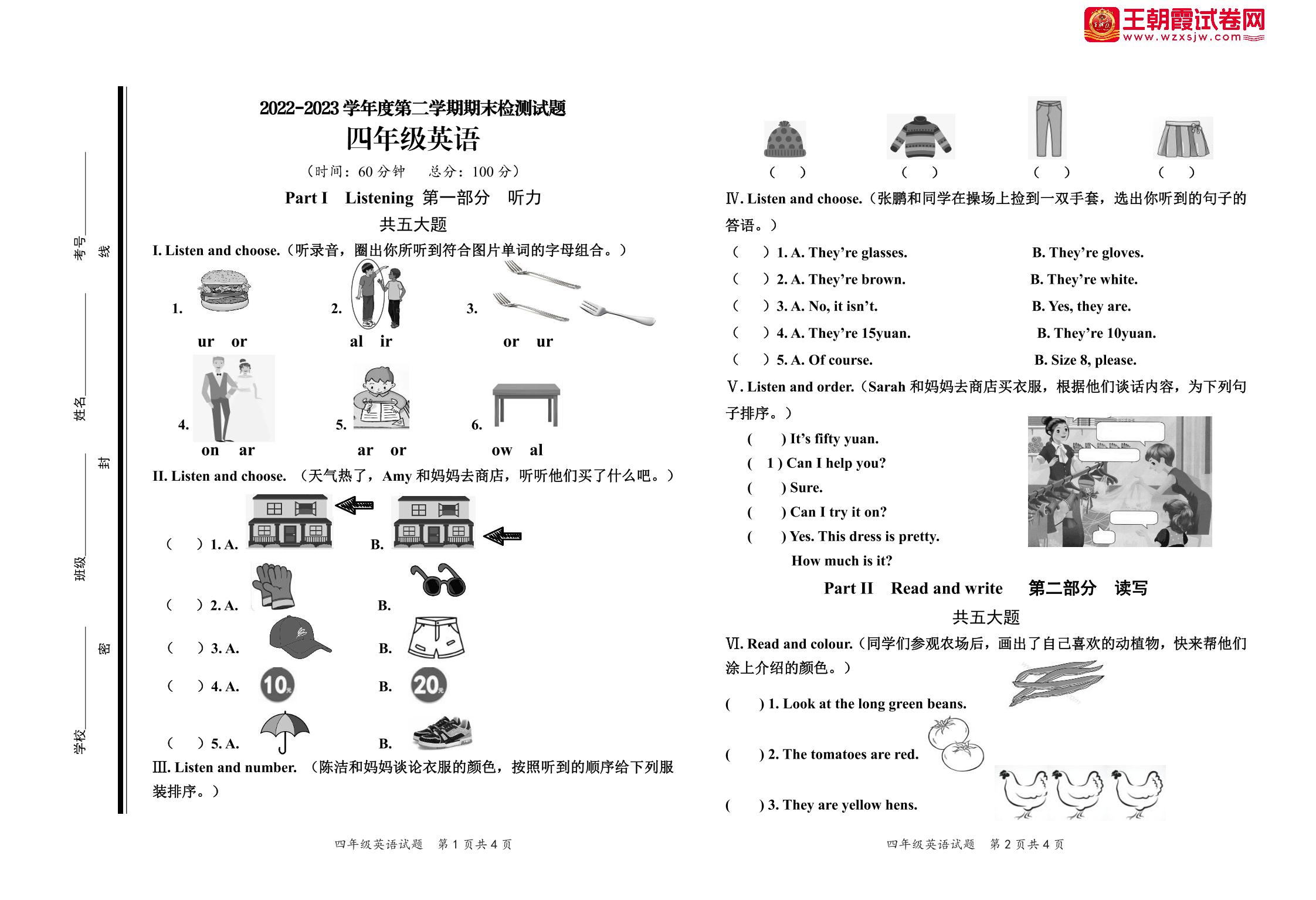 山东省枣庄市山亭区2022-2023学年度第二学期期末检测试题四年级英语(人教PEP版)【无听力音频】
