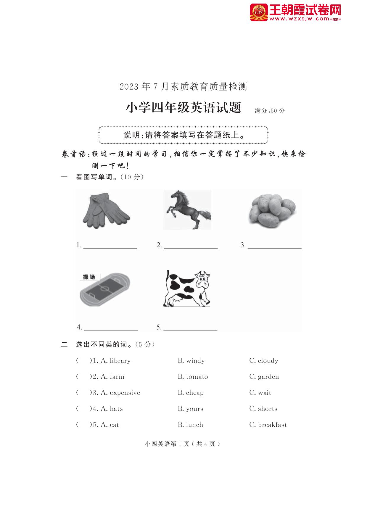 山东省菏泽市曹县2022-2023学年下学期期末素质教育质量检测四年级英语(人教PEP版)