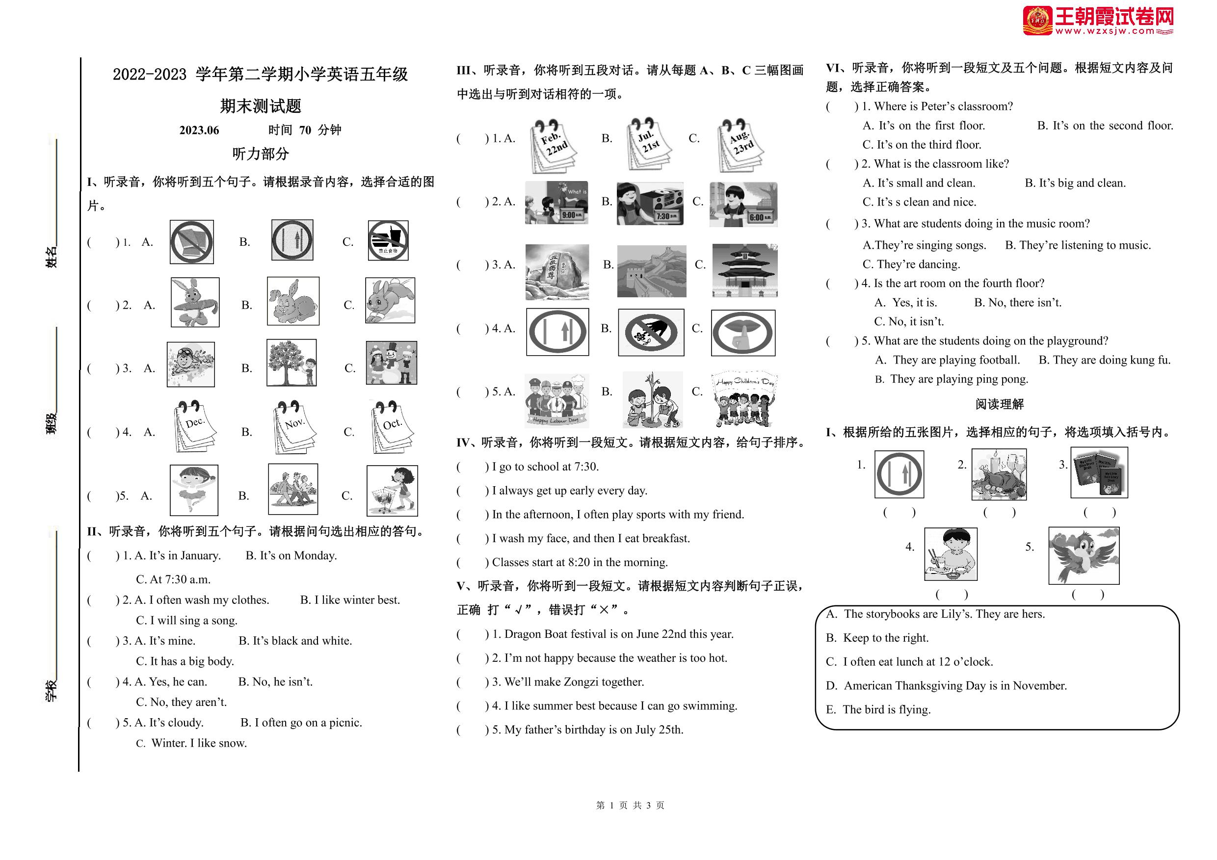 山东省济南市市中区2022-2023学年第二学期期末测试题五年级英语(人教PEP版)