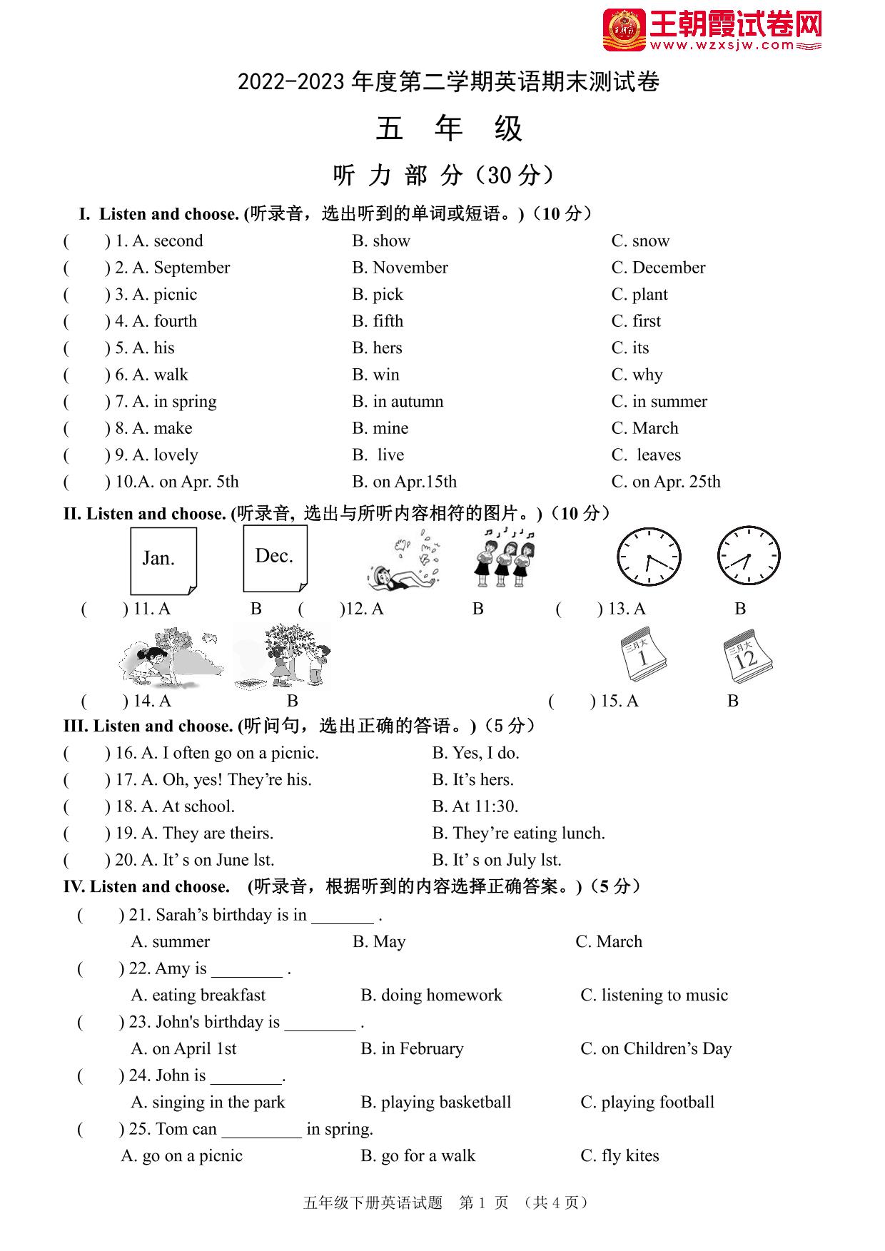 山东省济南市南山区2022-2023学年度第二学期期末测试卷五年级英语(人教PEP版)