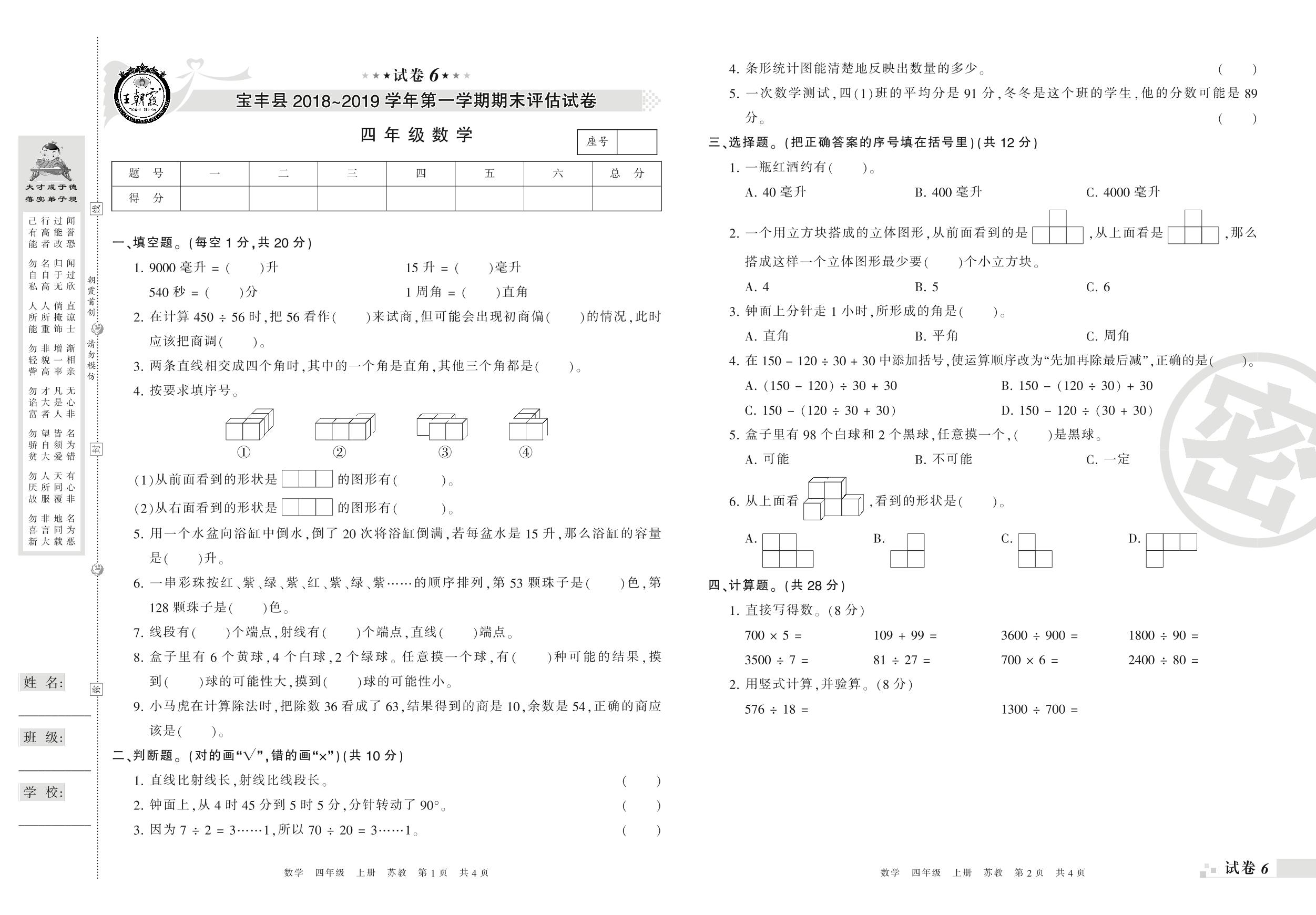 2018-2019学年第一学期平顶山市宝丰县四年级数学试卷(苏教版)【6】