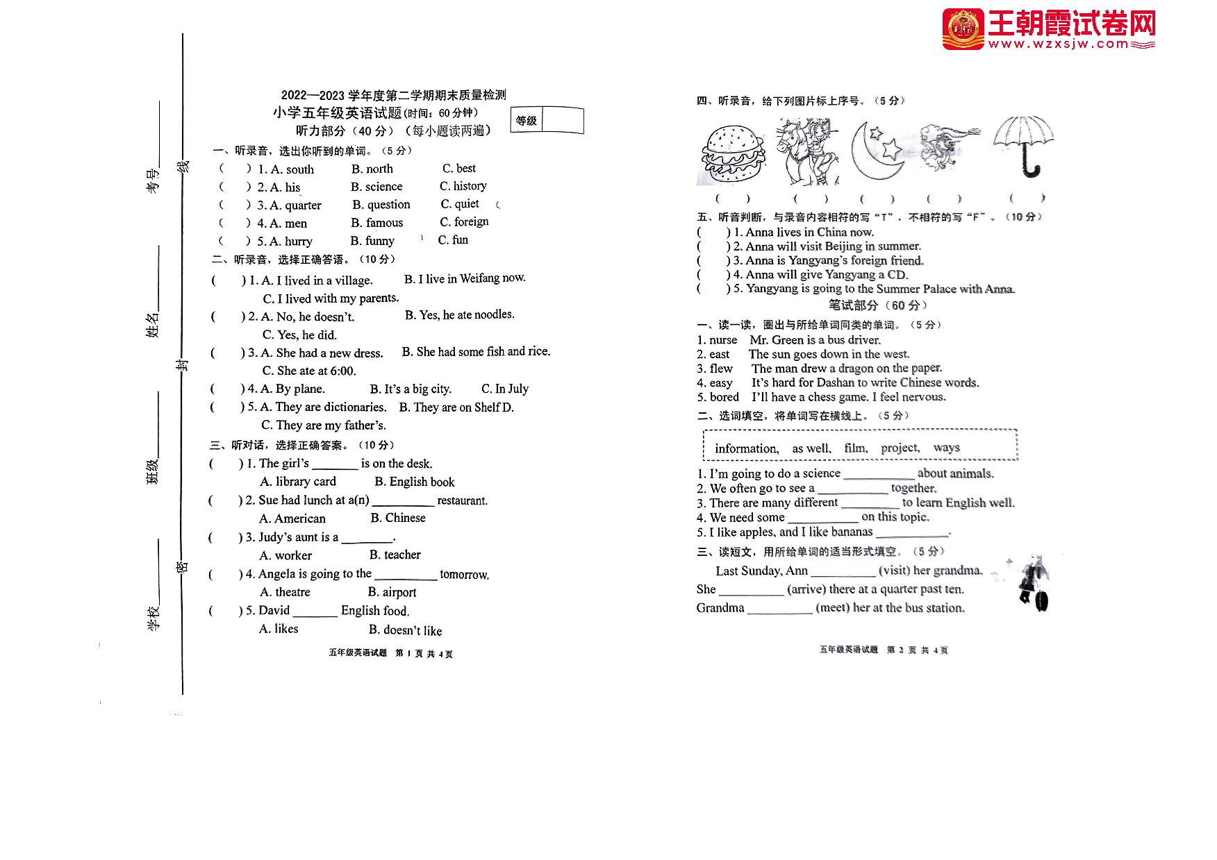 山东省潍坊市坊子区2022-2023学年度第二学期期末质量检测试题五年级英语(外研版)