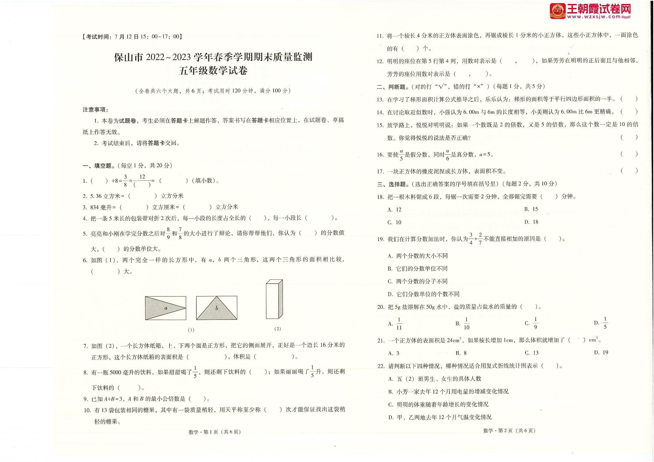 云南省保山市2022-2023学年第二学期期末质量监测试卷五年级数学(人教版)