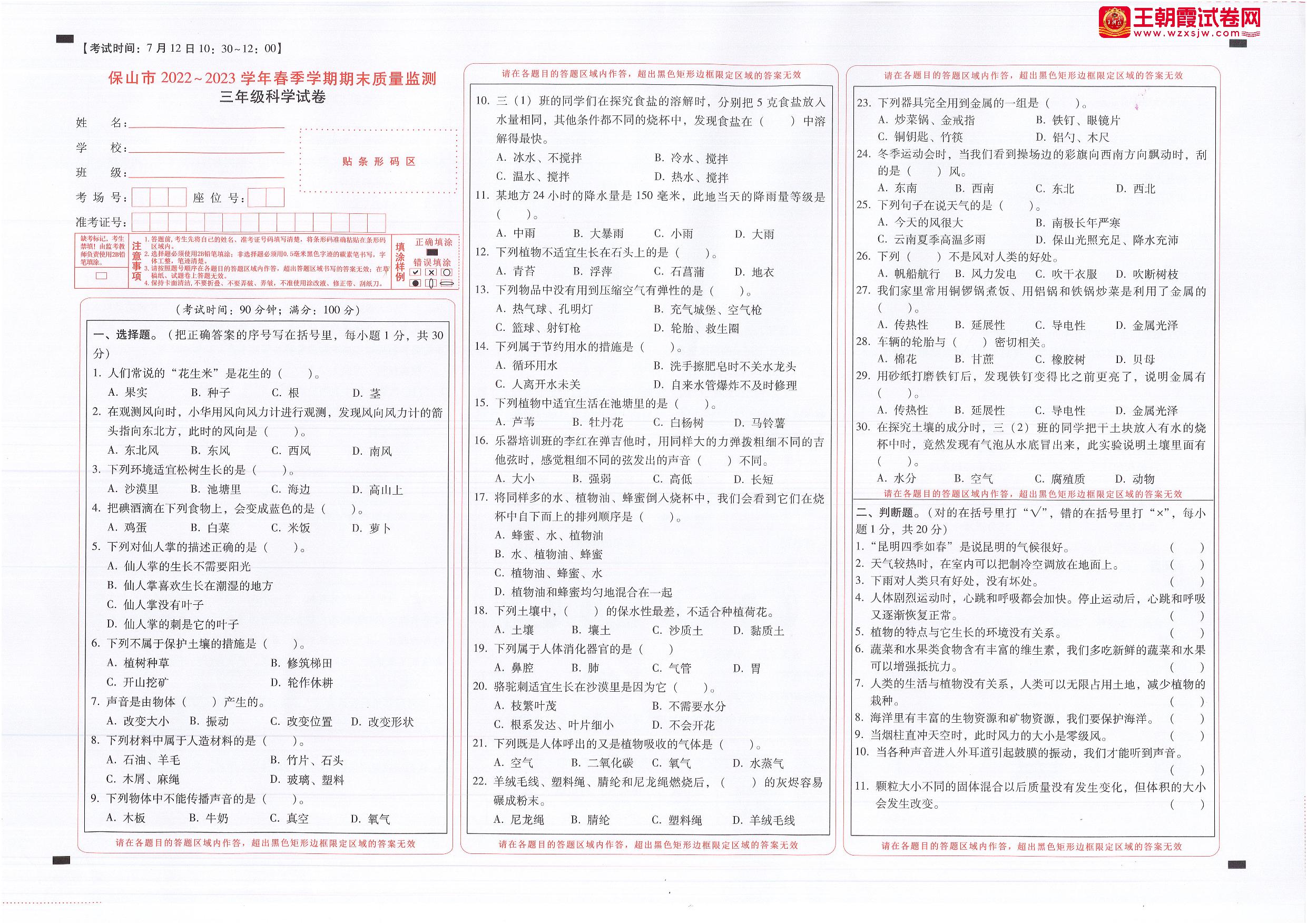 云南省保山市2022-2023学年第二学期期末质量监测试卷三年级科学(苏教版)