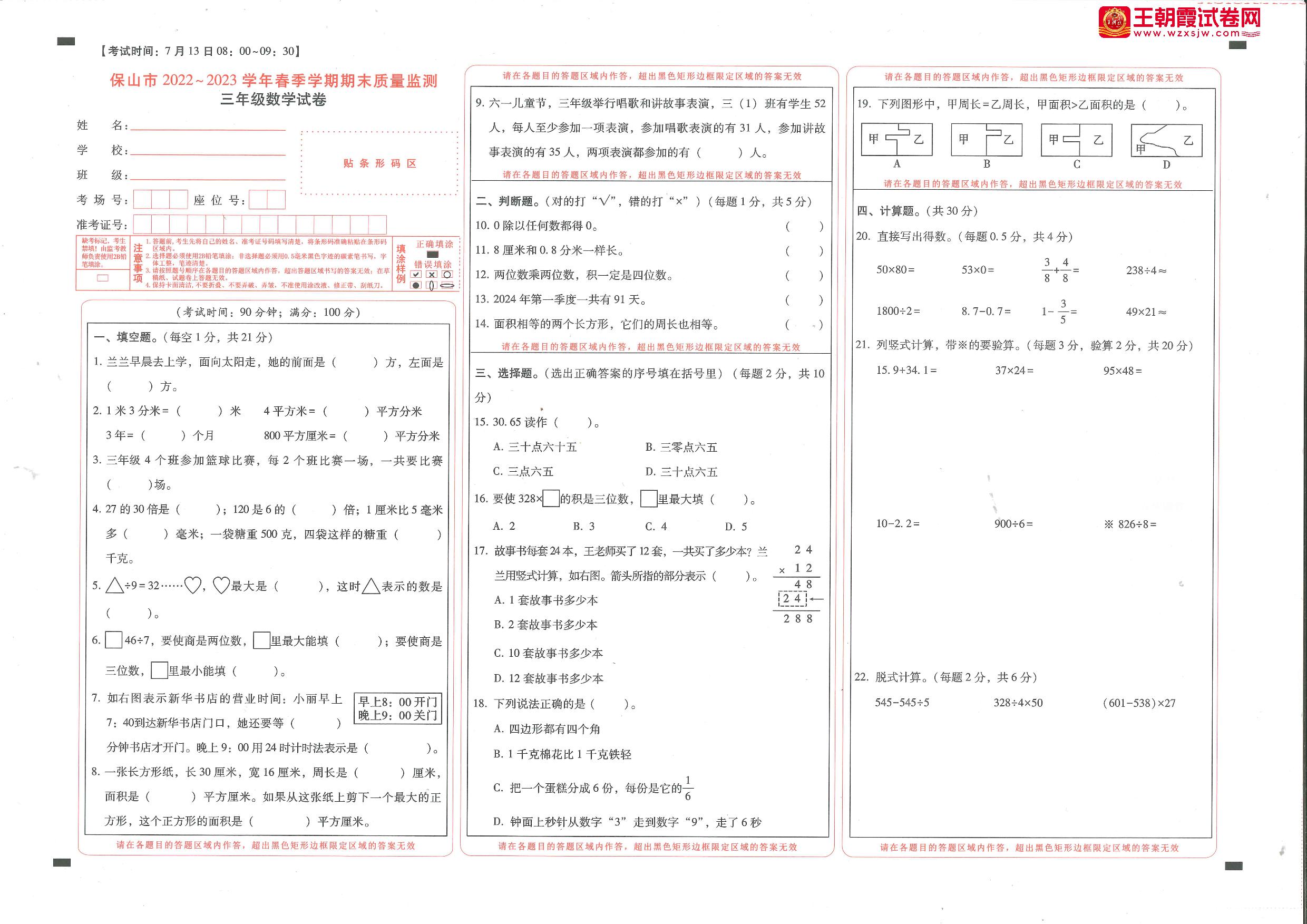 云南省保山市2022-2023学年第二学期期末质量监测试卷三年级数学(人教版)