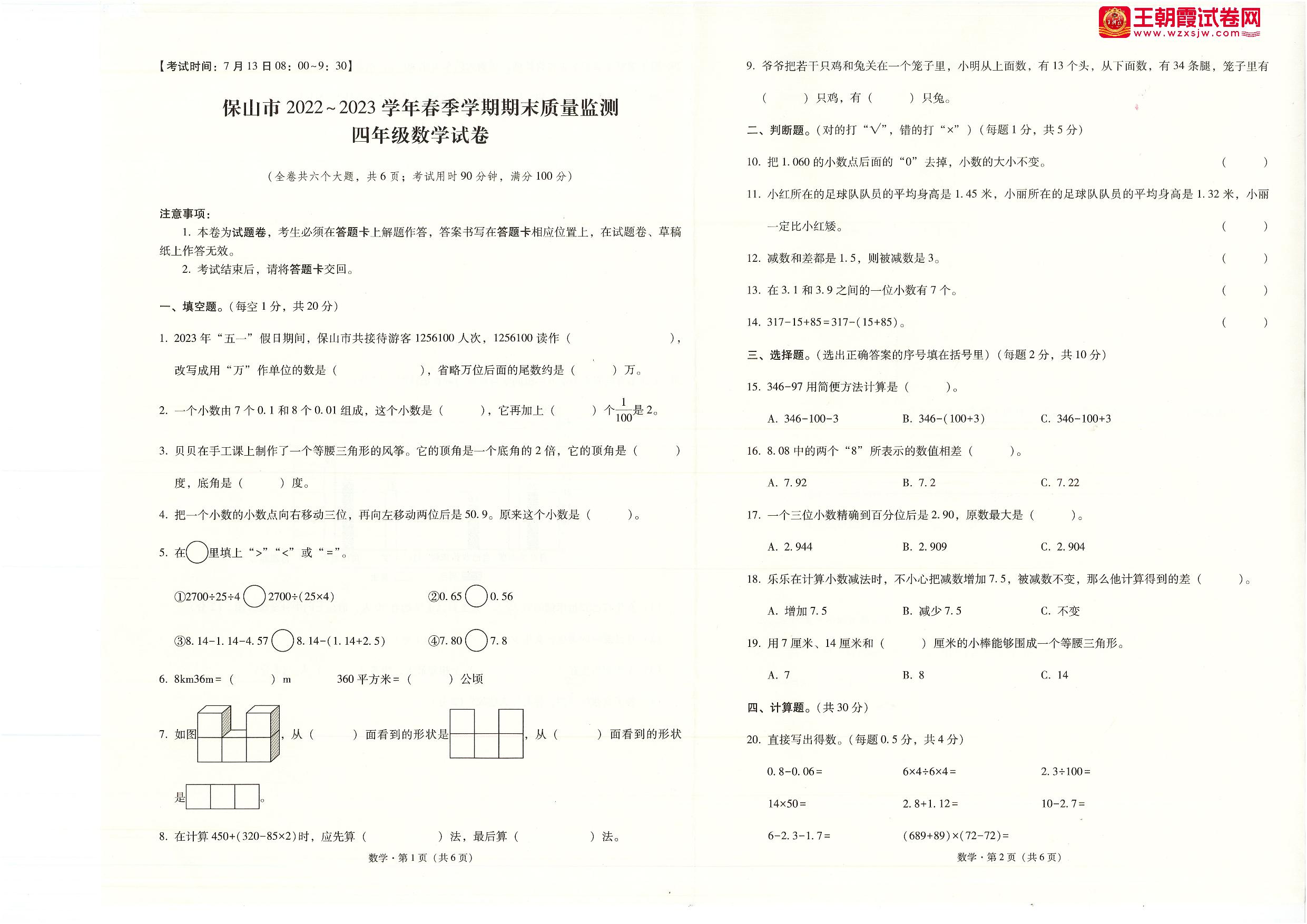 云南省保山市2022-2023学年第二学期期末质量监测试卷四年级数学(人教版)