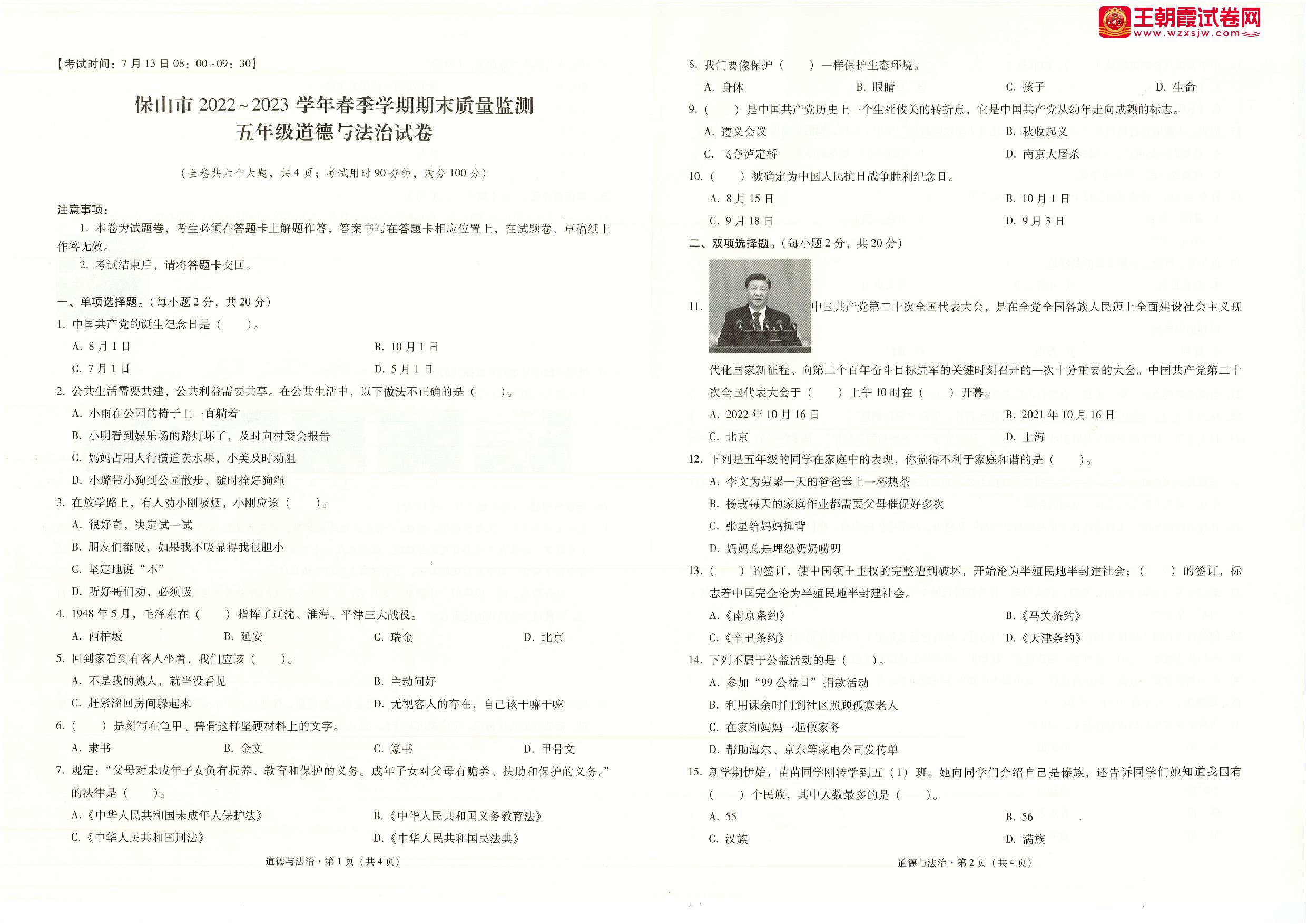 云南省保山市2022-2023学年第二学期期末质量监测试卷五年级道德与法治(人教版)