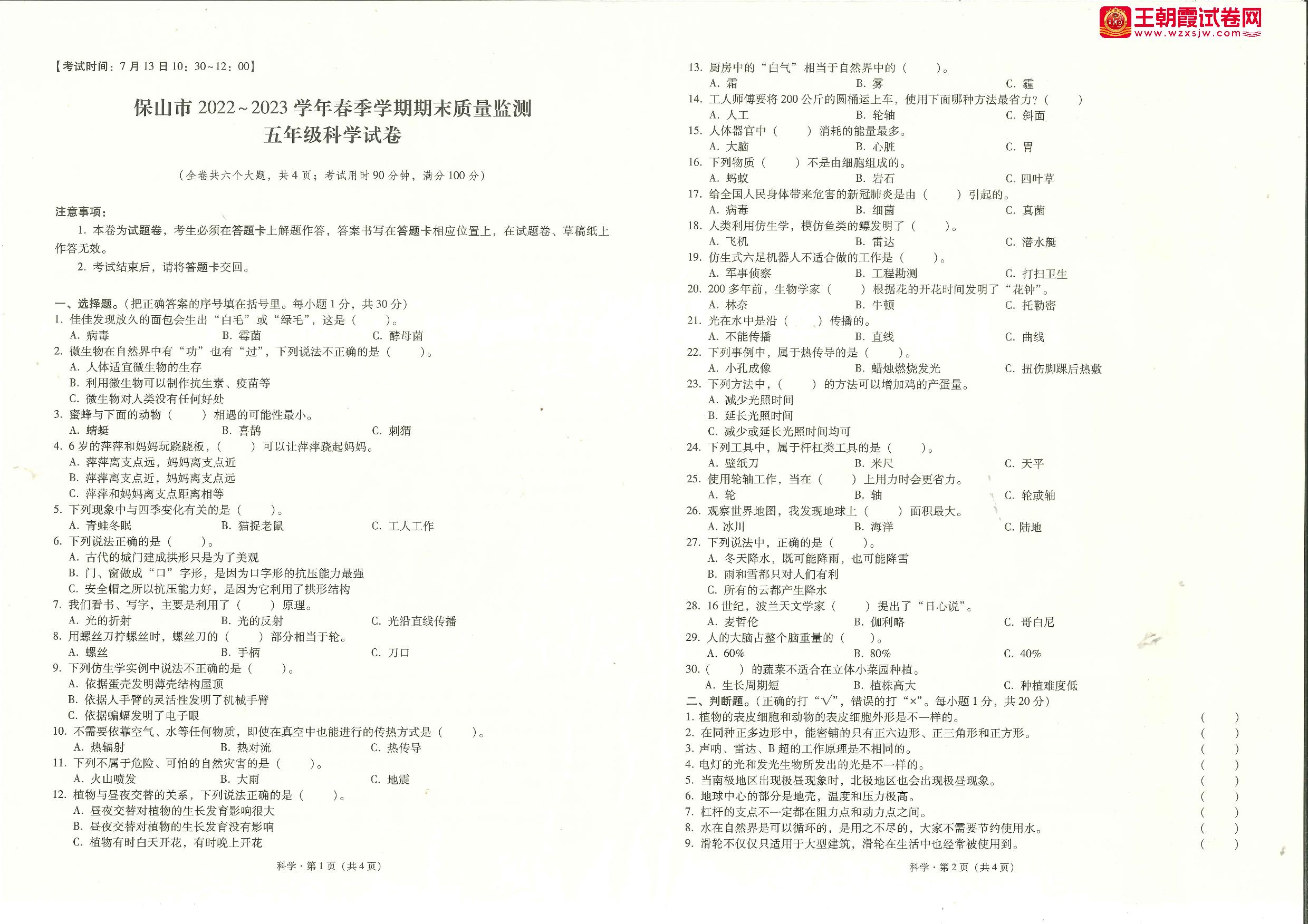 云南省保山市2022-2023学年第二学期期末质量监测试卷五年级科学(苏教版)