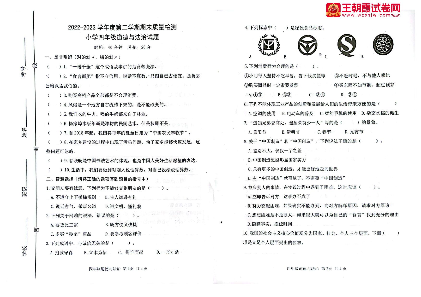 山东省潍坊市坊子区2022-2023学年度第二学期期末质量检测四年级道德与法治(人教版)
