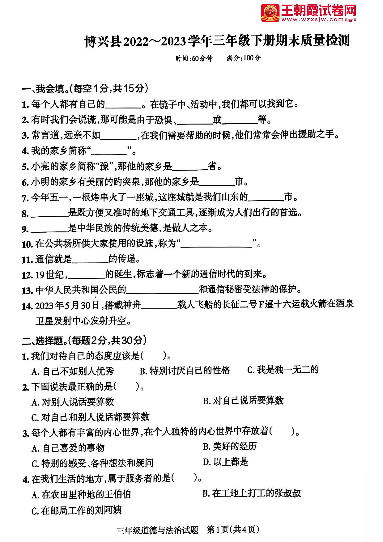 三年级道德与法治人教版下册期末卷