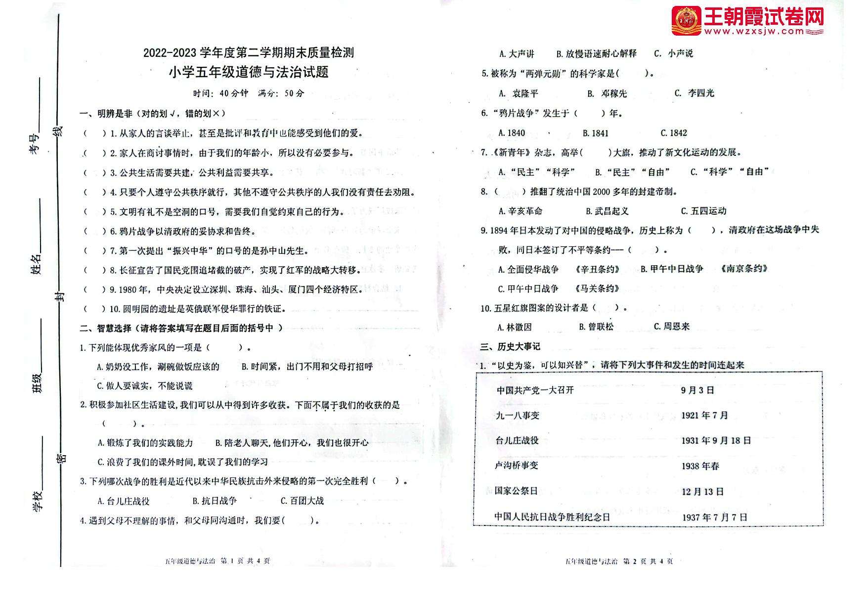 山东省潍坊市坊子区2022-2023学年度第二学期期末质量检测五年级道德与法治(人教版)