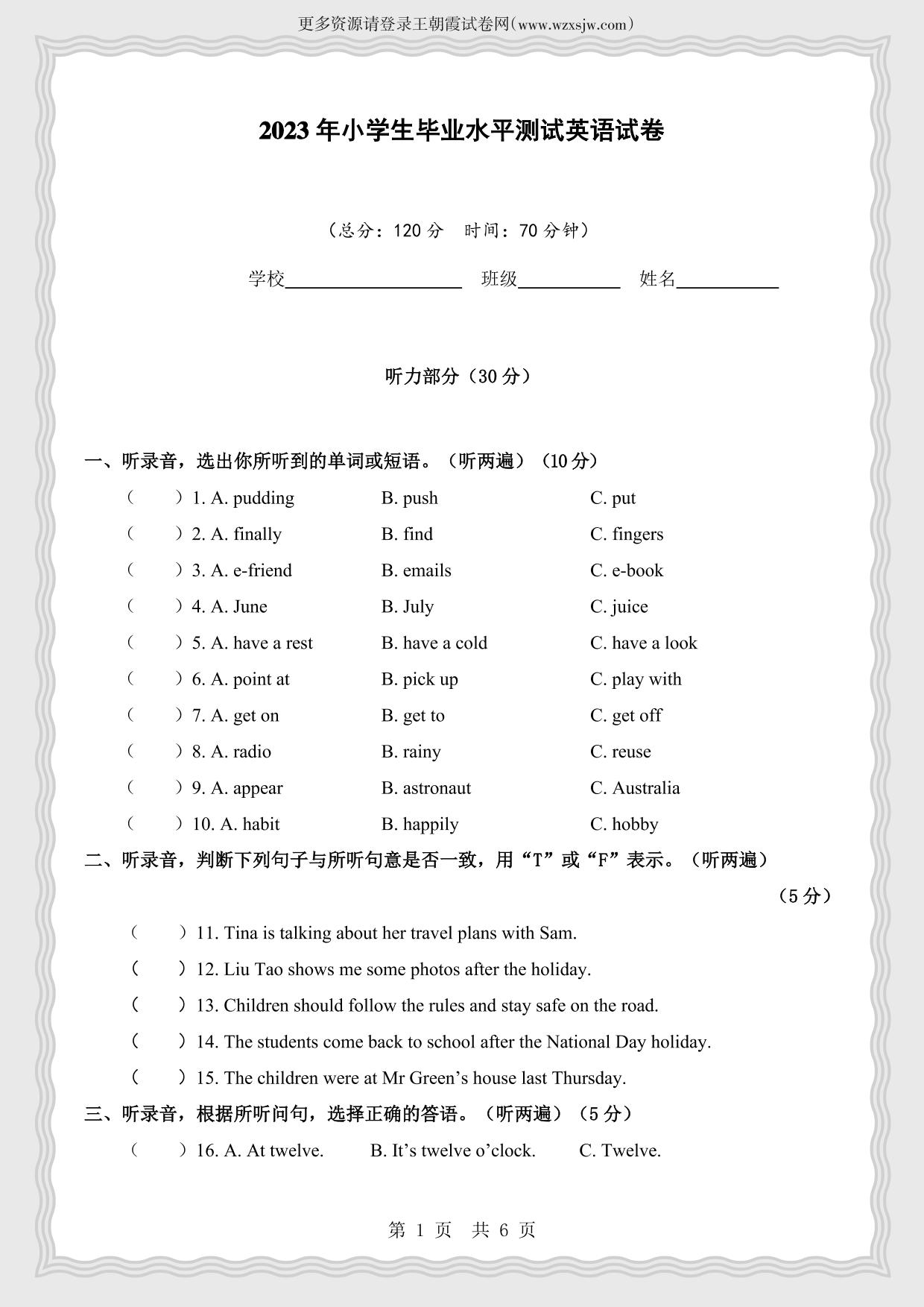 江苏省淮安市淮安区2023年小学生毕业水平测试试卷六年级英语(译林版)