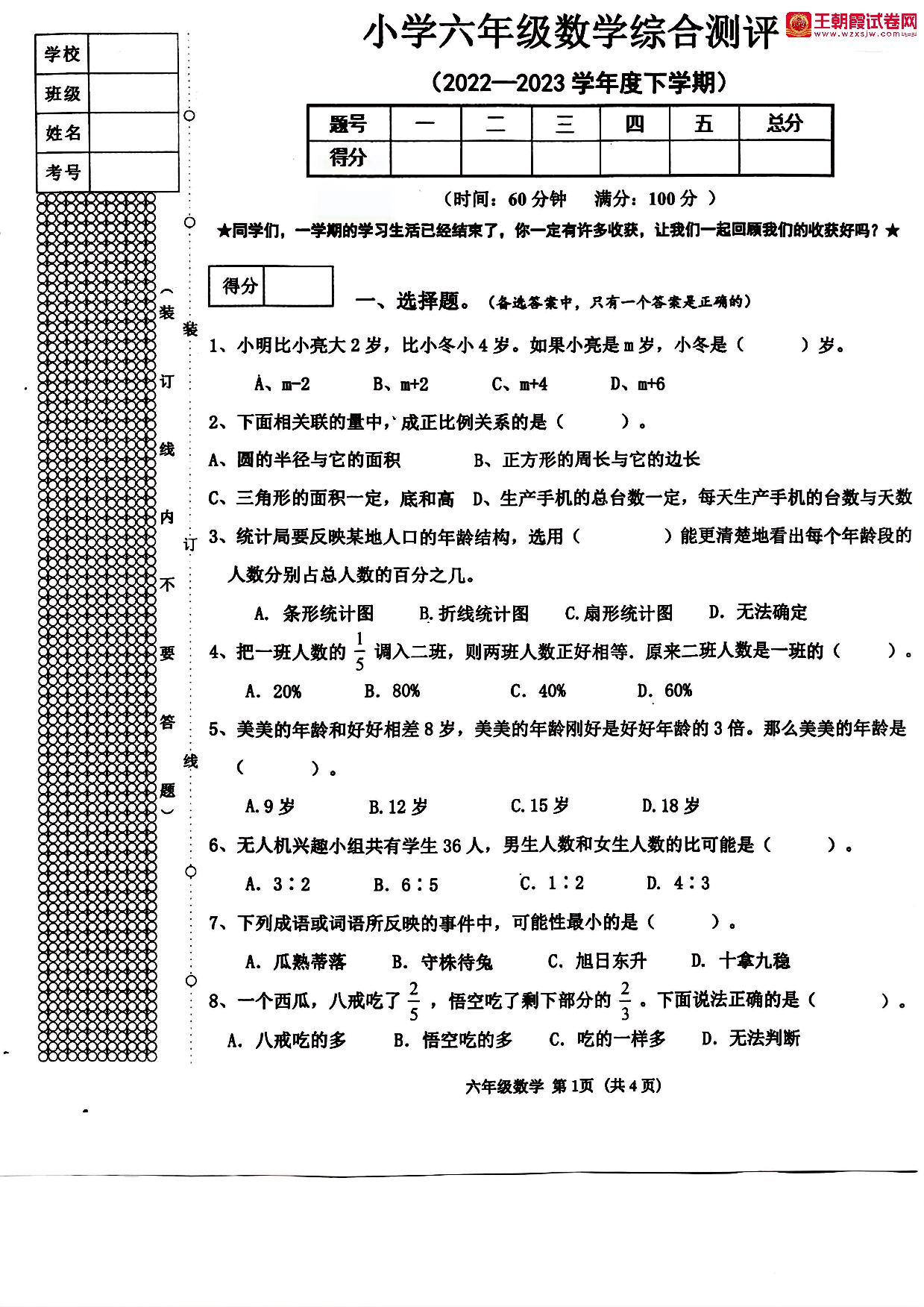 辽宁省沈阳市皇姑区2022-2023学年度下学期期末综合测评六年级数学(北师版)
