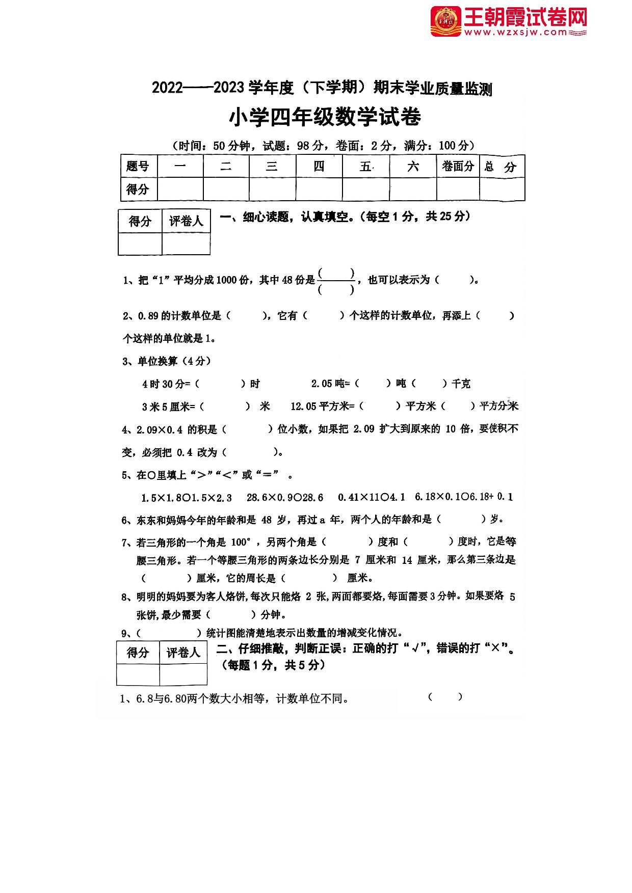 辽宁省丹东市宽甸县2022-2023学年度下学期期末学业质量监测四年级数学(北师版)