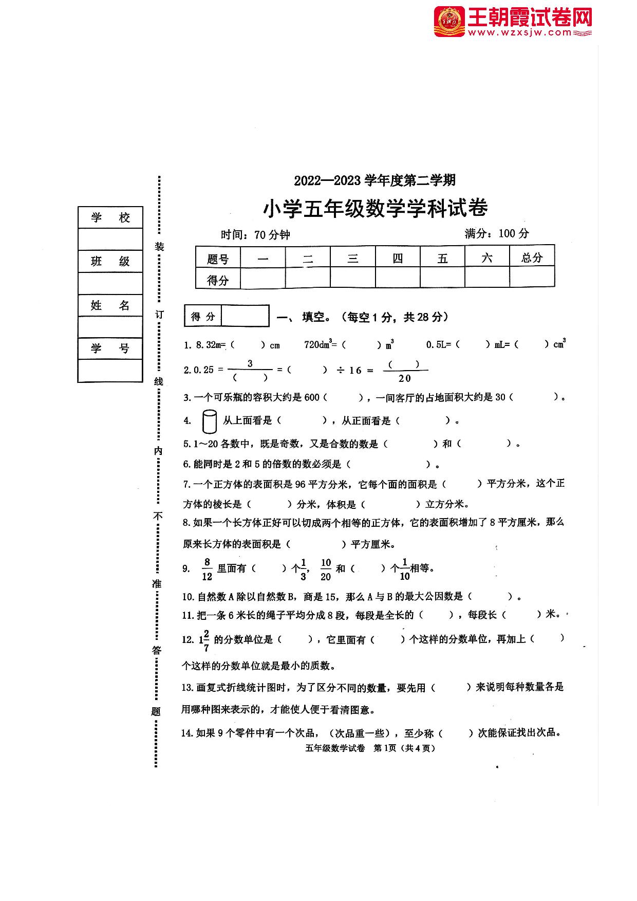 五年级数学人教版下册期末卷