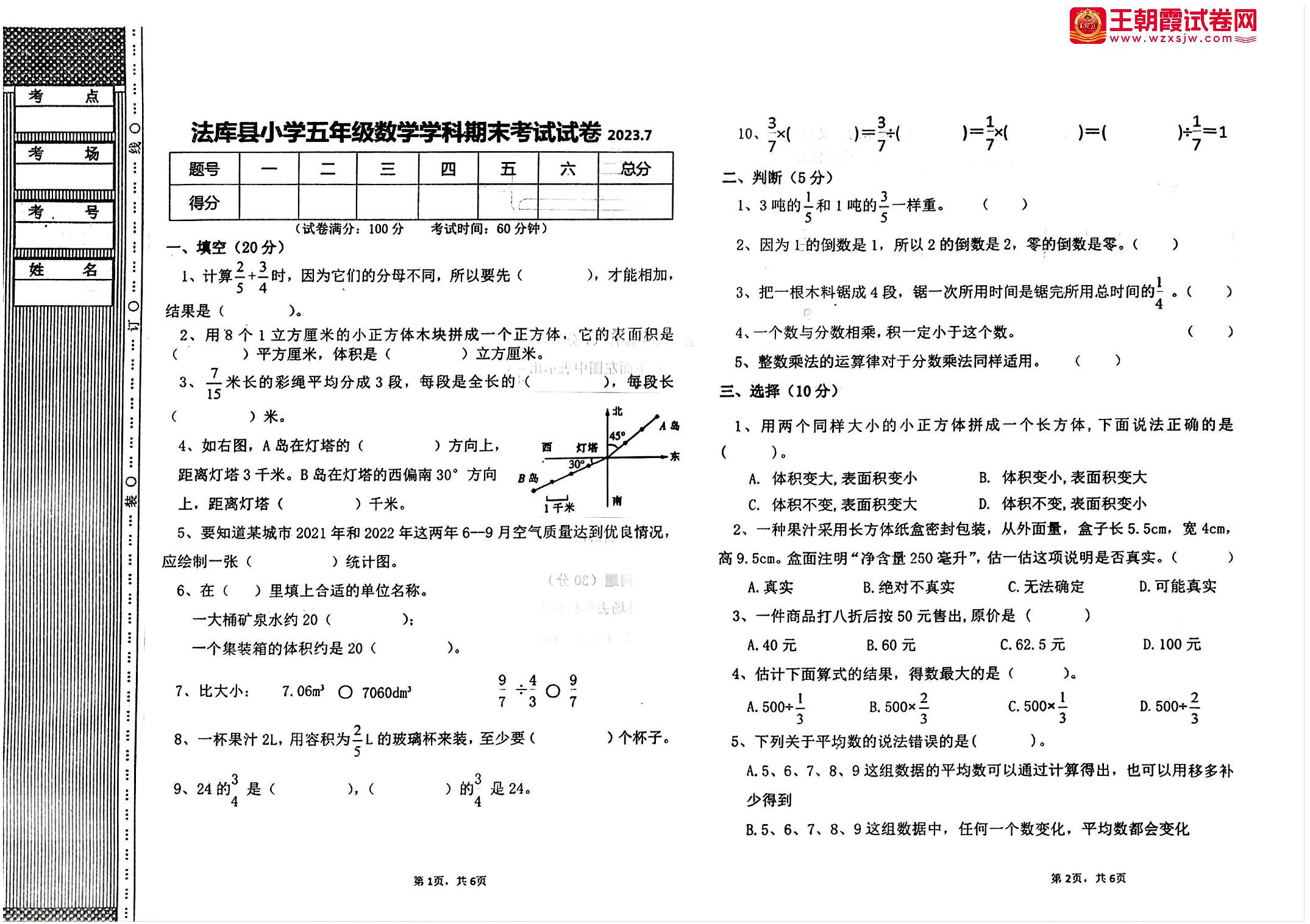 辽宁省沈阳市法库县2022-2023学年下学期期末考试五年级数学(北师版)
