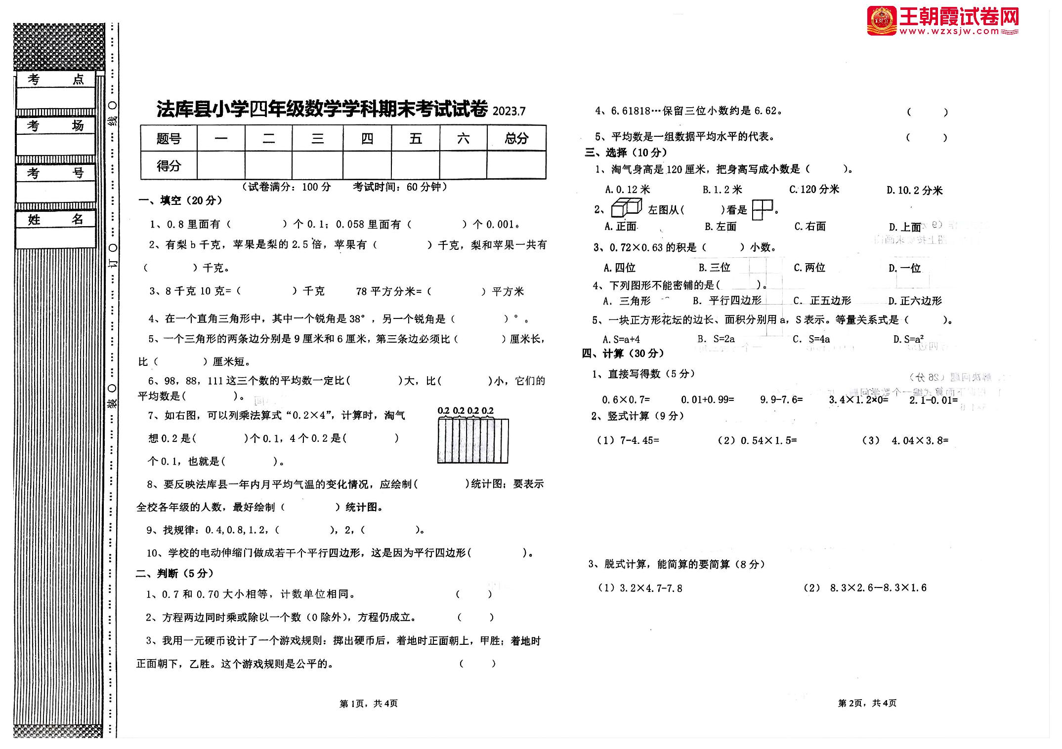 辽宁省沈阳市法库县2022-2023学年下学期期末考试四年级数学(北师版)