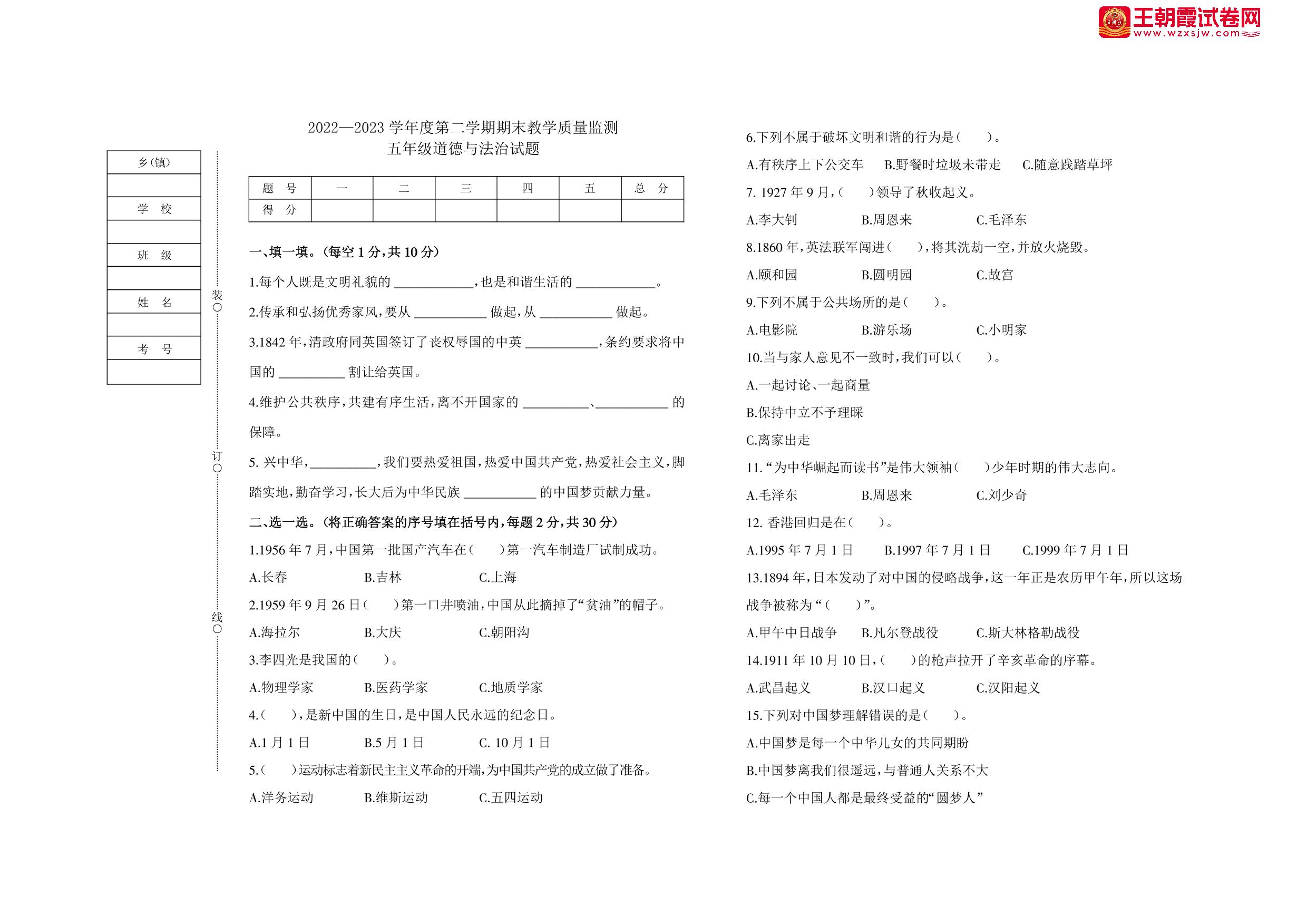 辽宁省葫芦岛市绥中县2022-2023学年度第二学期期末教学质量监测五年级道德与法治(人教版)