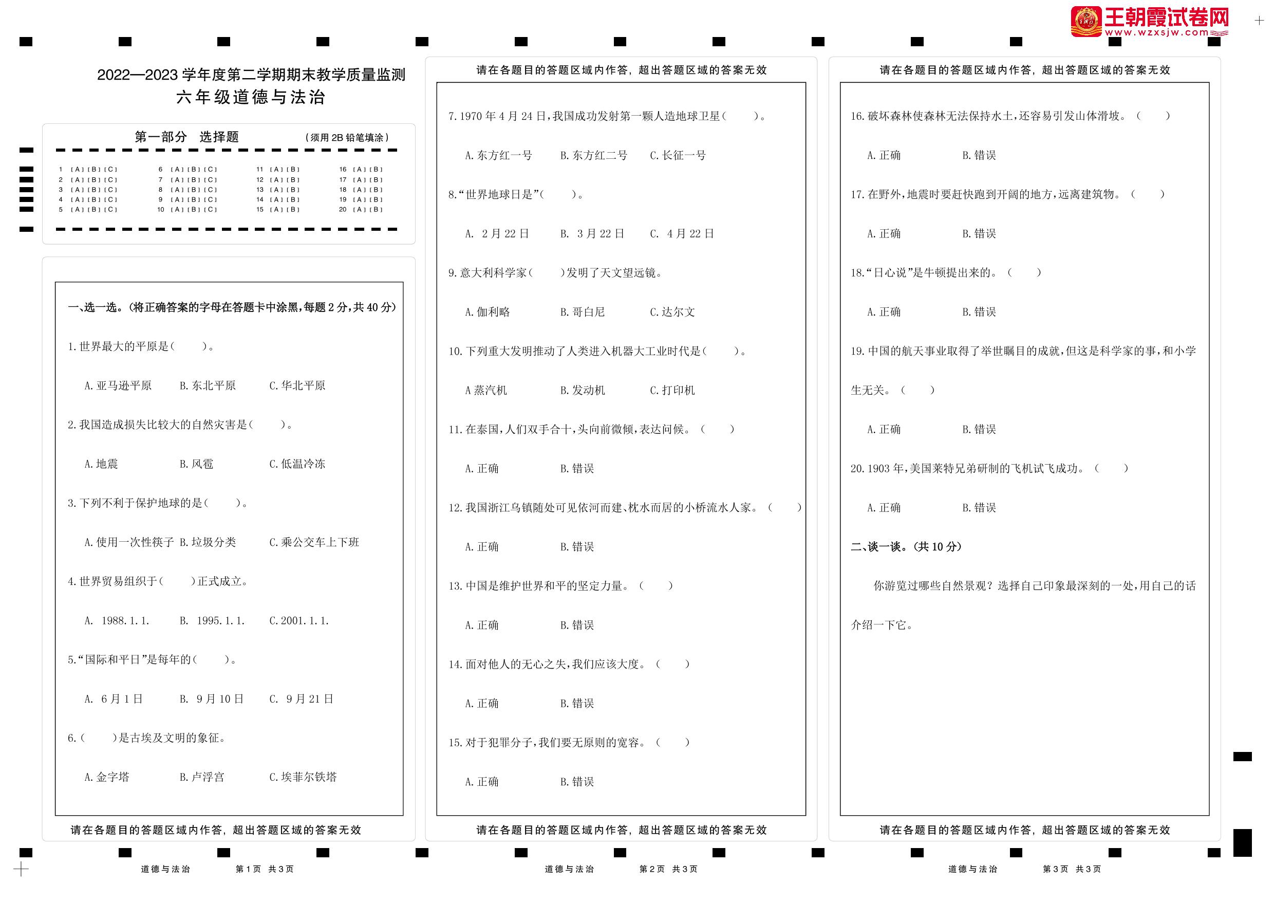 六年级道德与法治北师版下册期末卷