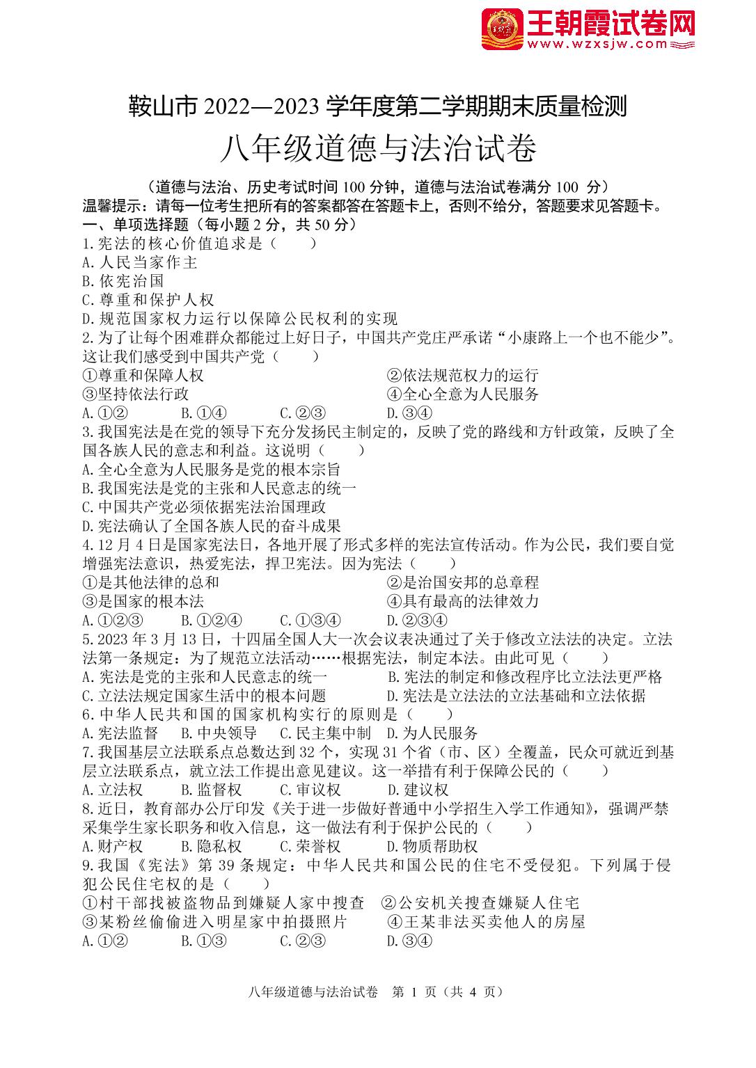 辽宁省鞍山市2022-2023学年度第二学期期末质量检测八年级道德与法治(人教版)